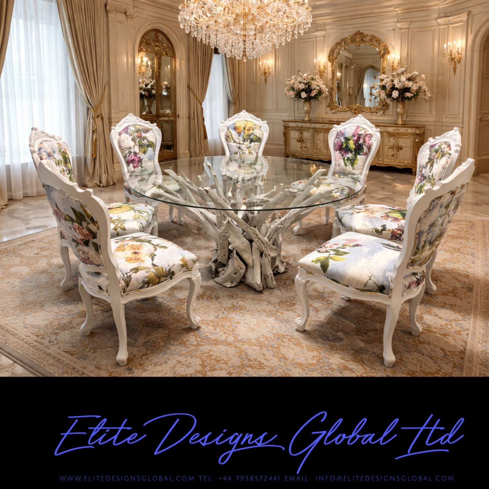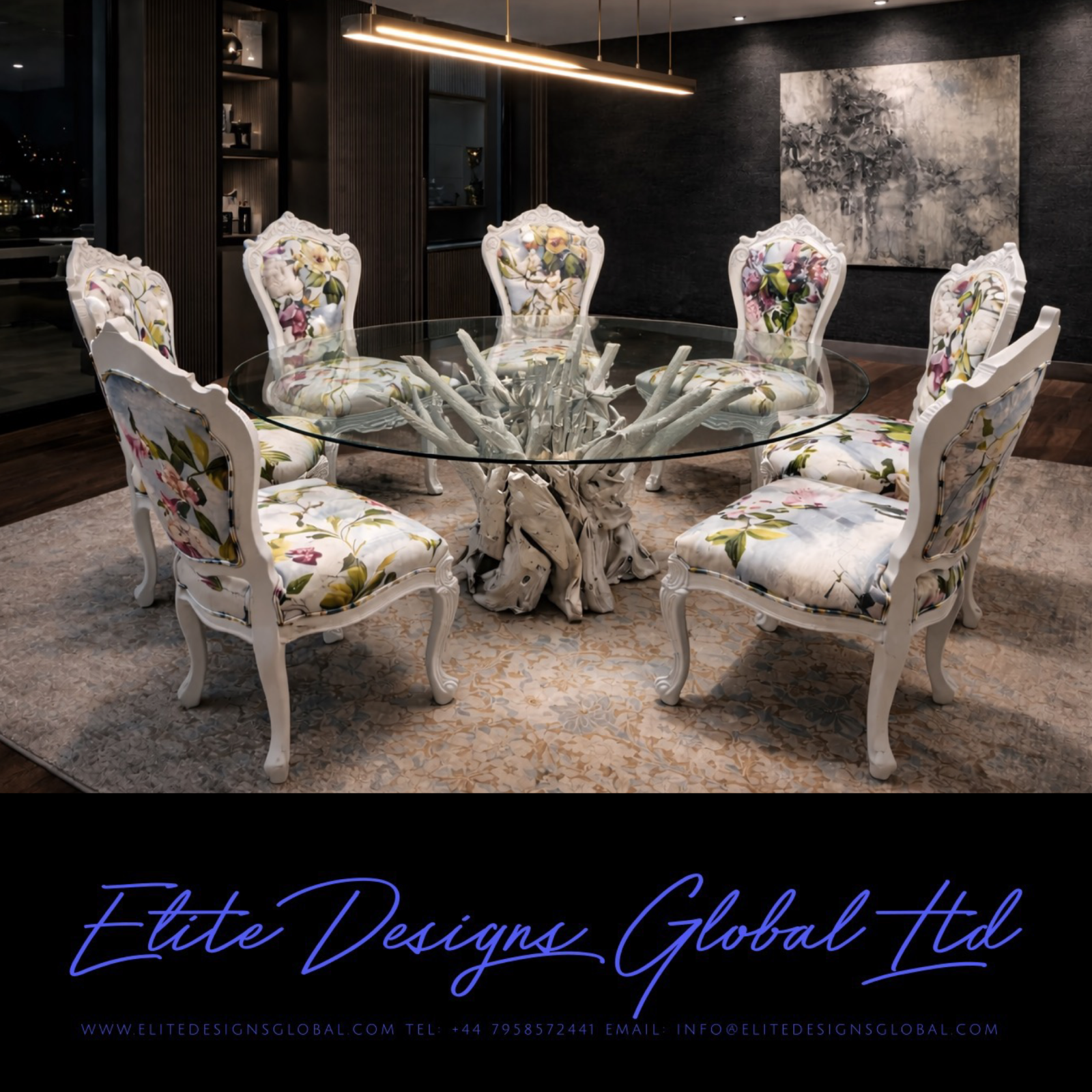 Amazing exclusive Elite Art Deco style Elite Designer Driftwood and Glass top circular Dining table & Designer Chair set.