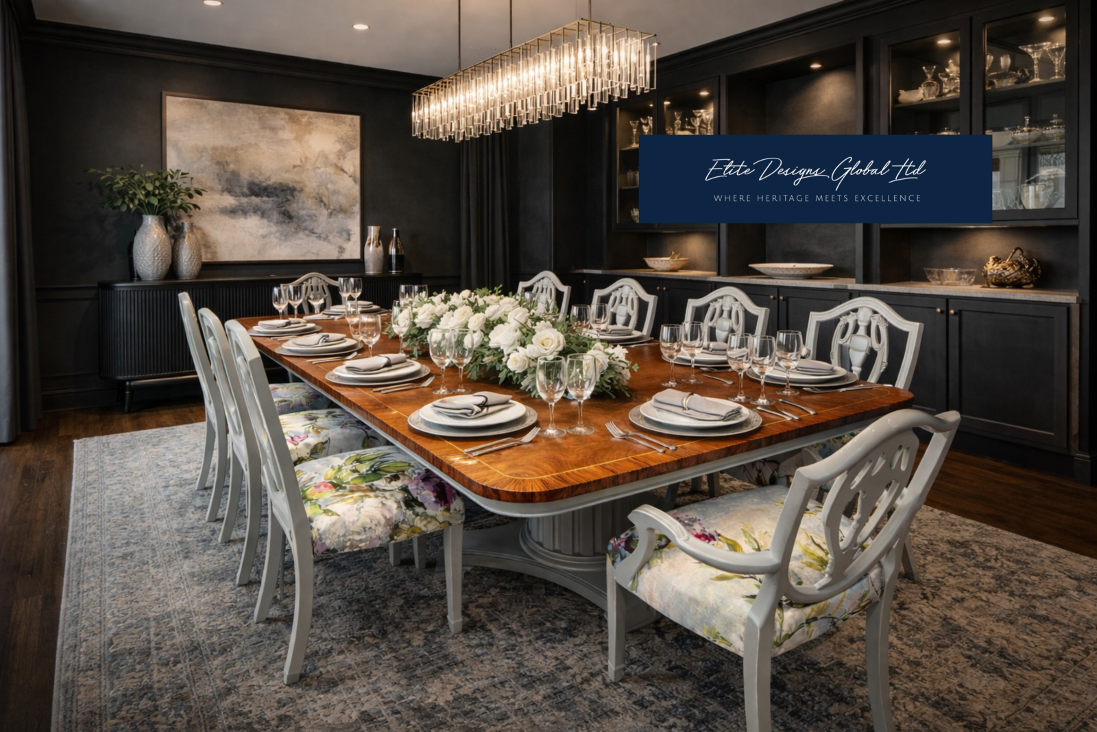 Elite exclusive Art Deco style Dining set French Polished and finished in Farrow and Ball Parma grey / Designers Guild fabric chairs