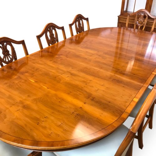Art Deco Grand Regency style Burr Yew tree dining table set.