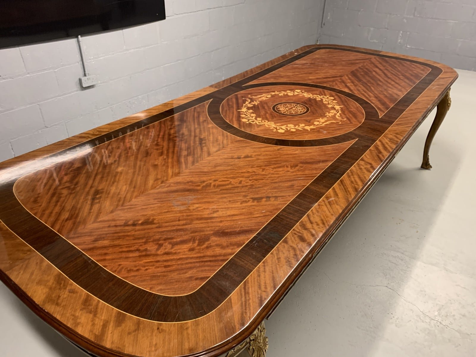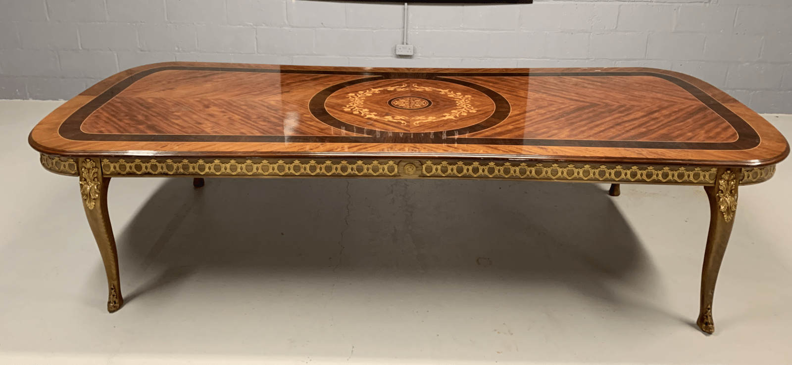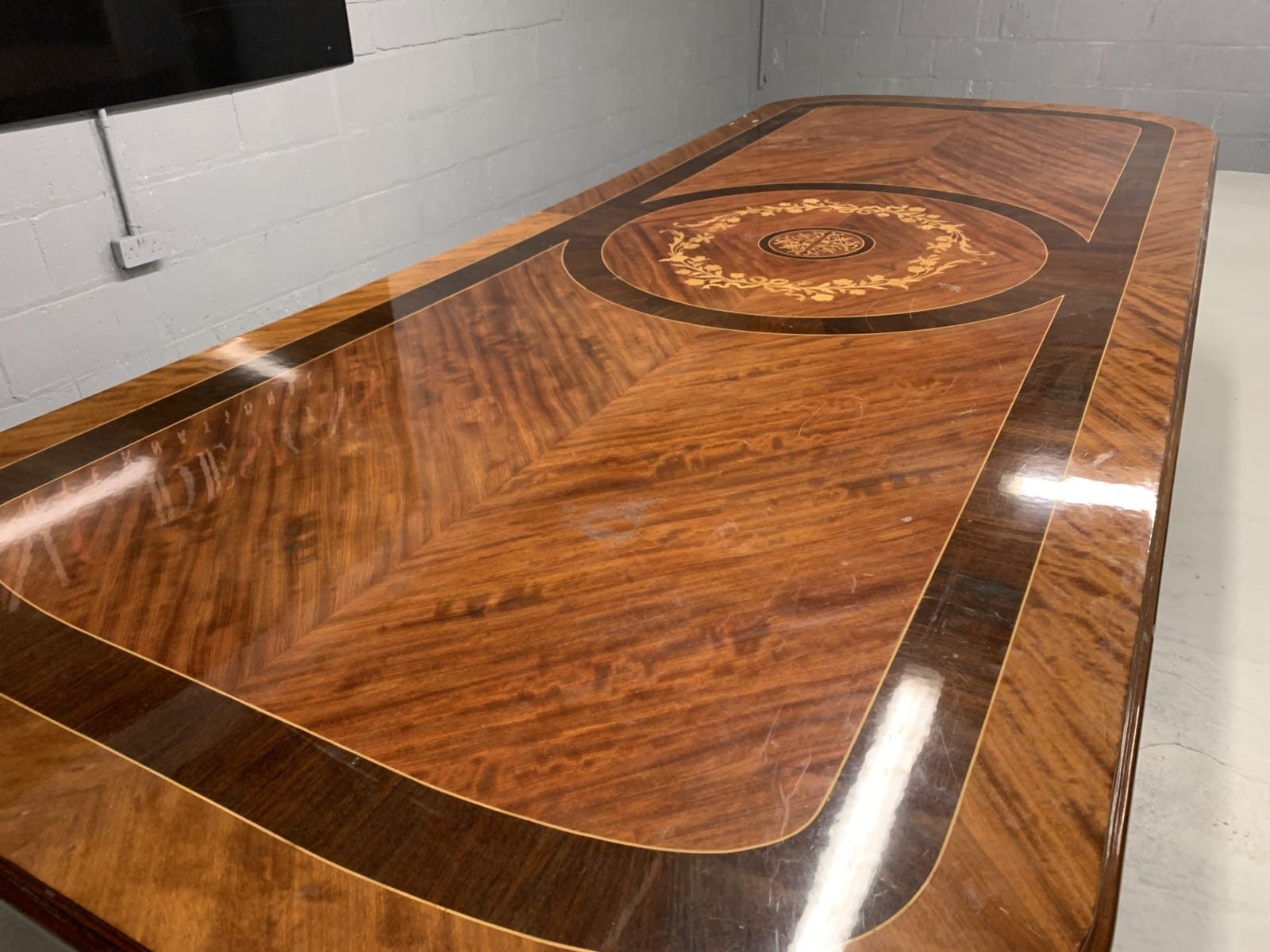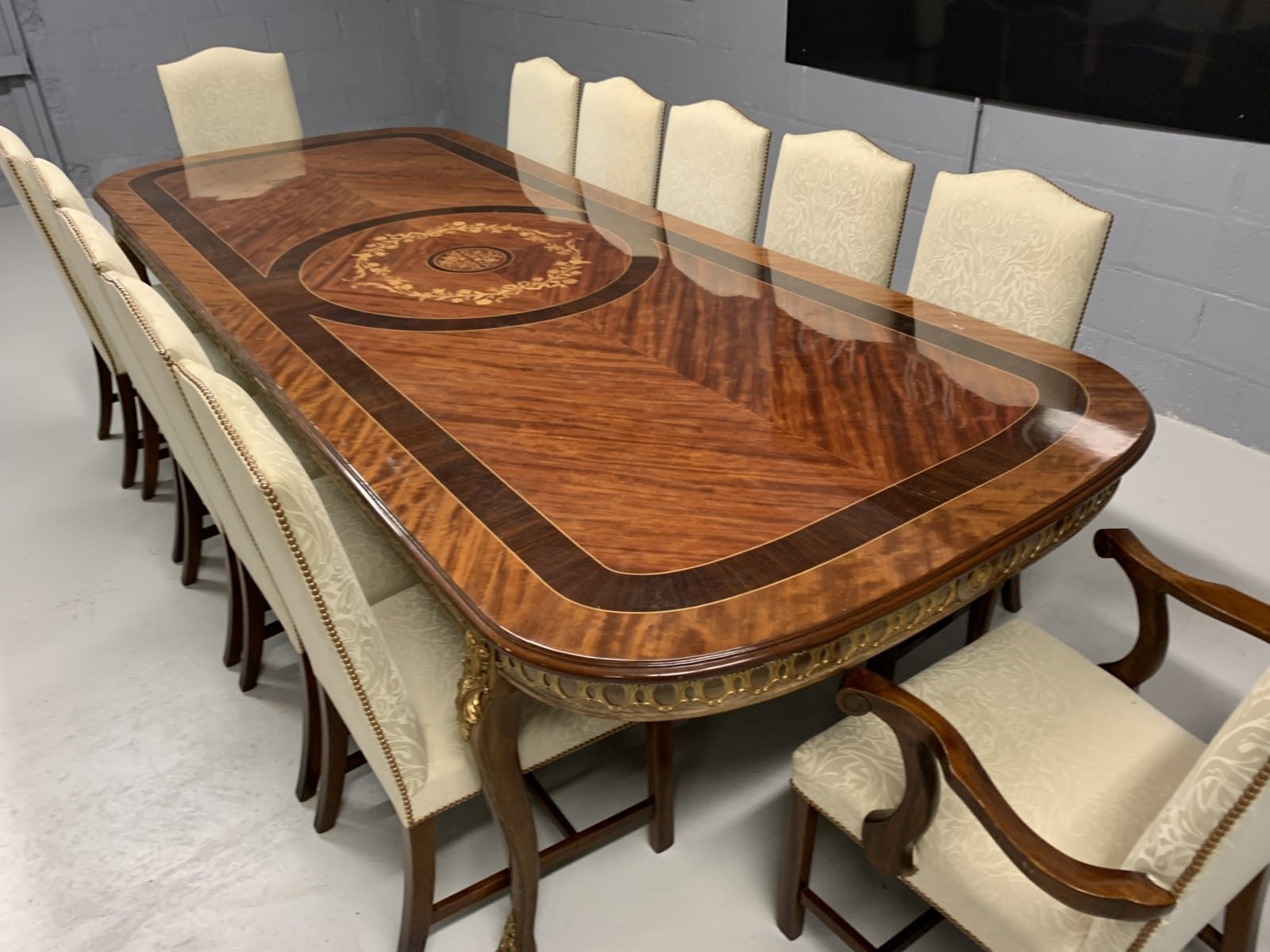 A simply exclusive gorgeous Grand Elite designer Burr Maple, rosewood Marquetry dining table.