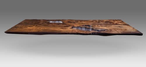 The cracks and knots are filled with a coloured and transparent clear epoxy resin.