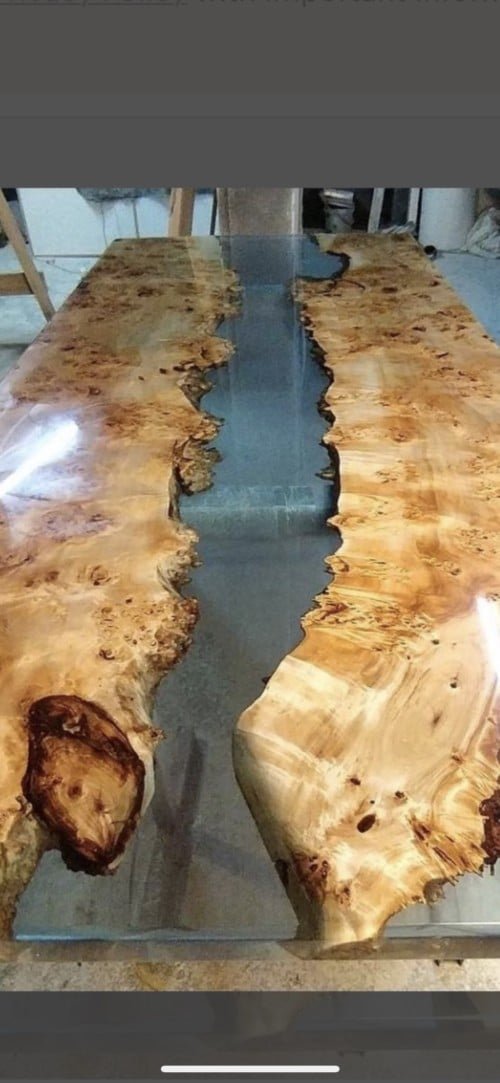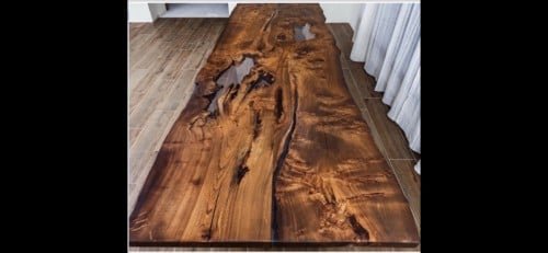 The cracks and knots are filled with either a coloured or transparent clear epoxy resin.