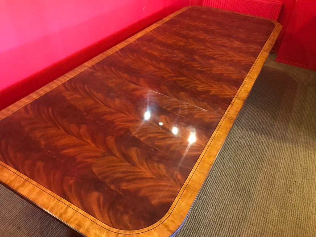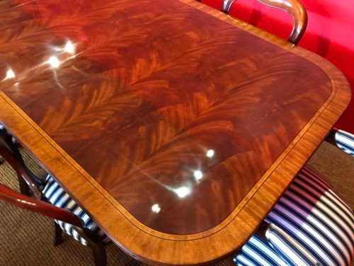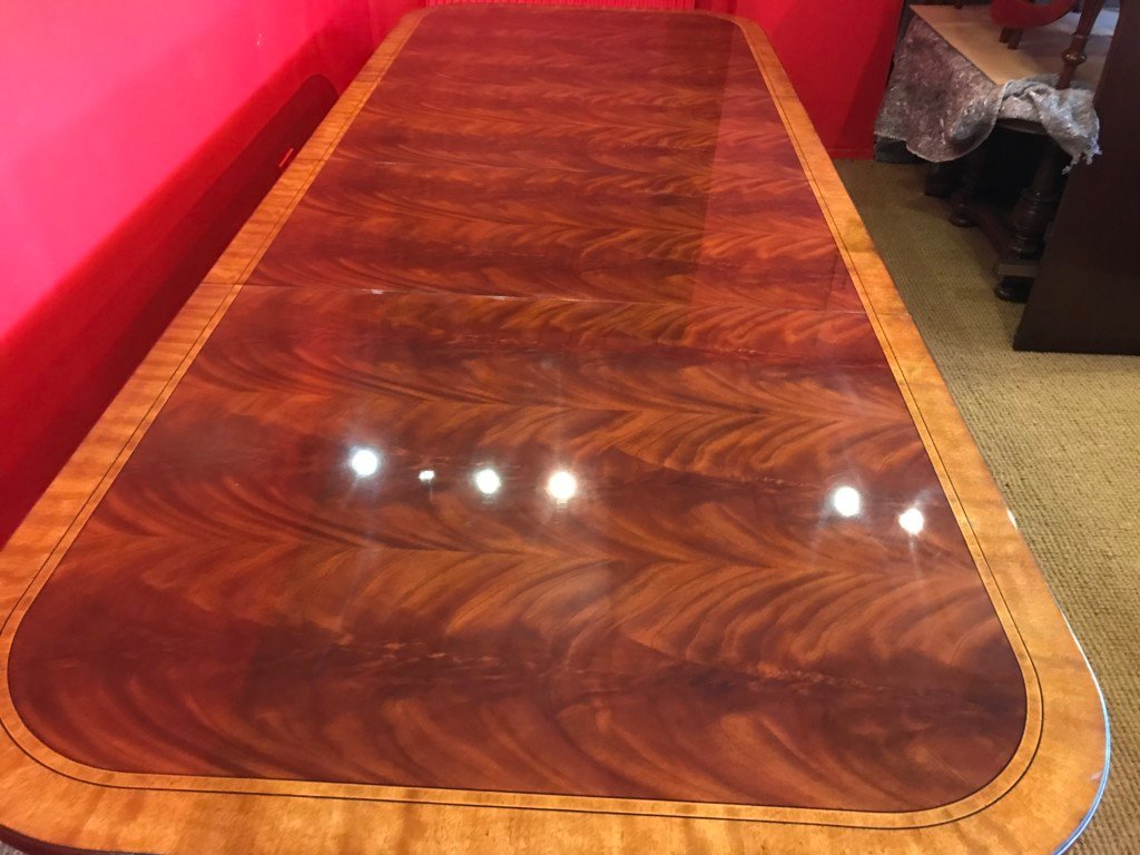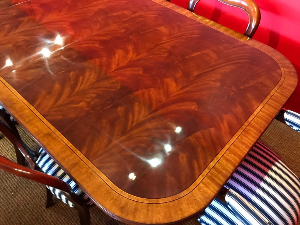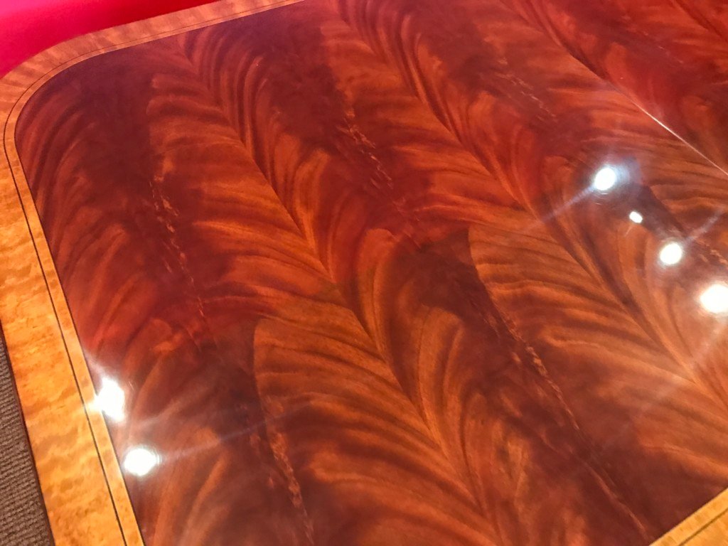 It’s in the traditional natural warm mahogany colour to show off the beautiful movement mahogany & now has once again that deep lustrous shine & gleam to it that still only hand French polishing can achieve using the very finest modern table top French Polishes & materials to obtain the stunning finish we desire, which also now give quite a hard & heat resistant finish compared to the old French Polishes of the past.