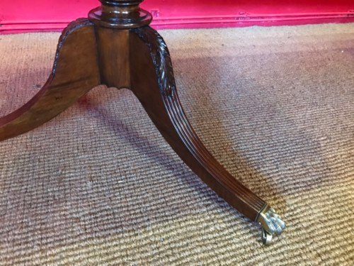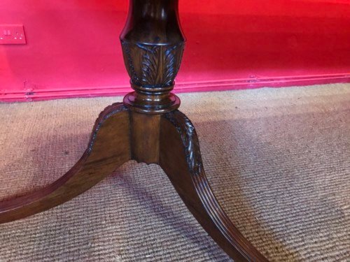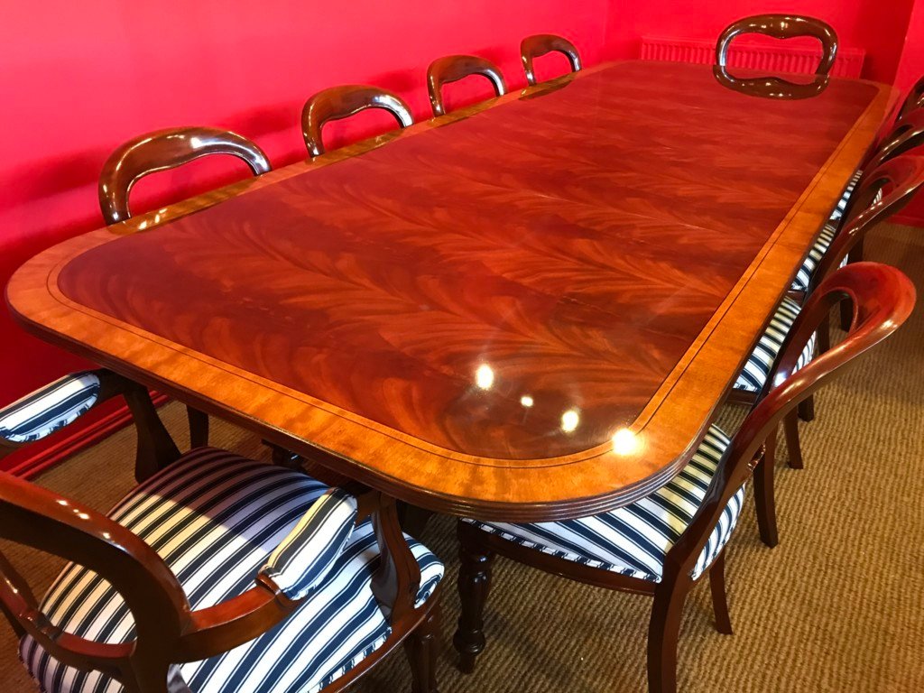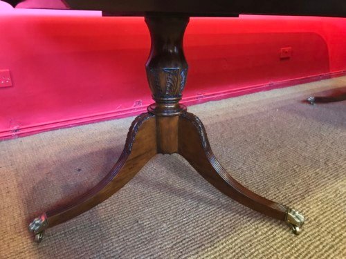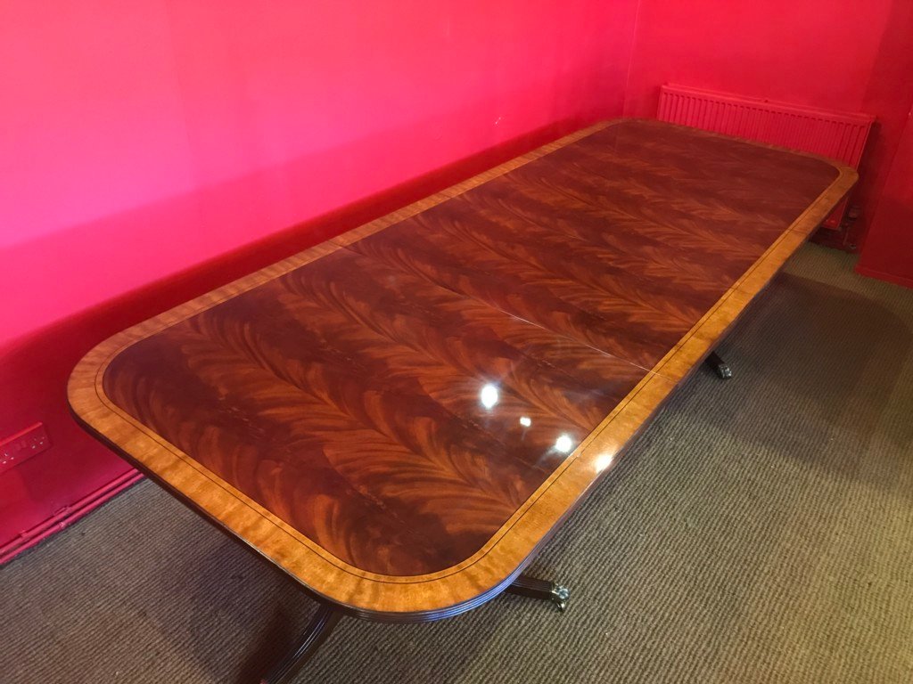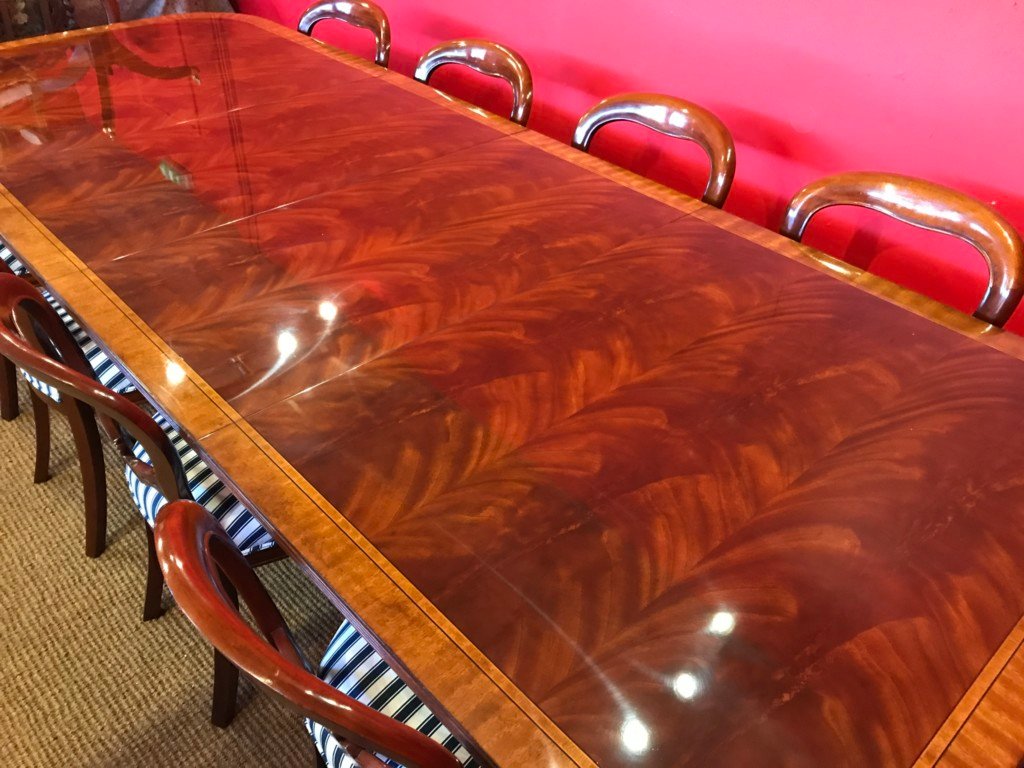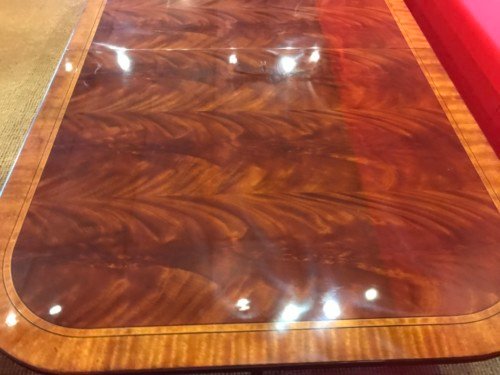 It’s in the traditional natural warm mahogany colour to show off the beautiful movement mahogany & now has once again that deep lustrous shine & gleam to it that still only hand French polishing can achieve using the very finest modern table top French Polishes & materials to obtain the stunning finish we desire, which also now give quite a hard & heat resistant finish compared to the old French Polishes of the past.
