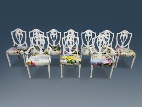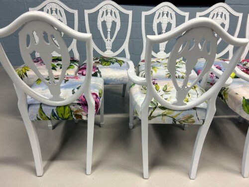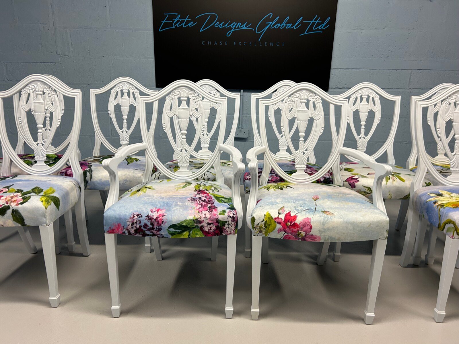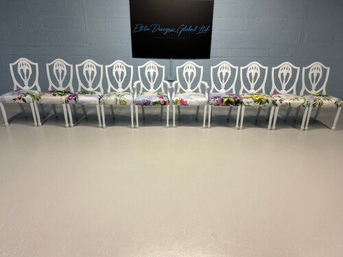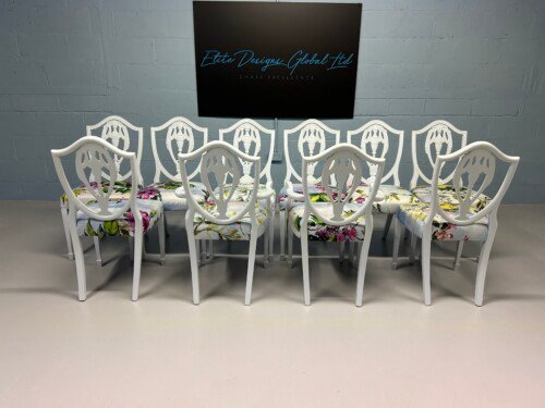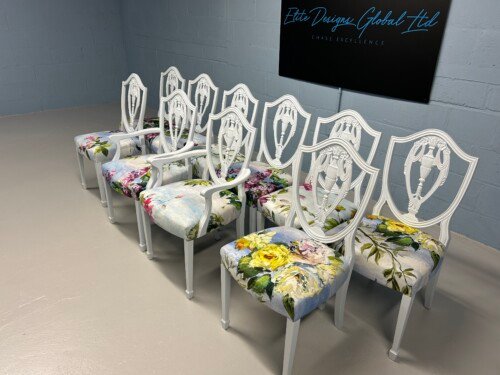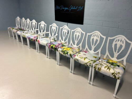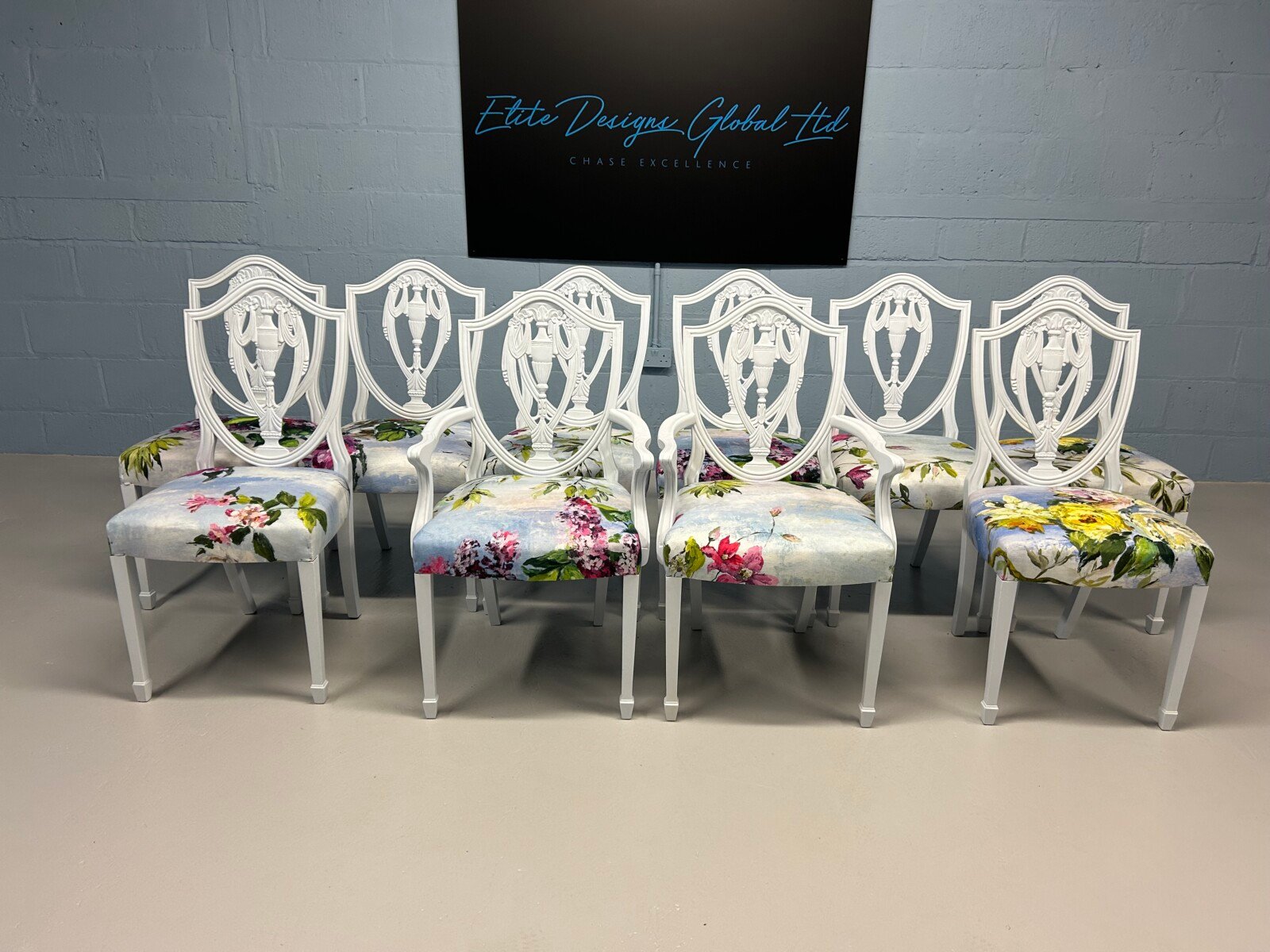 A beautiful exquisite set of 10 Prince of Wales style Art Deco exclusive Designers Guild dining chairs finished, in the eye catching Caprifoglio grande and Sky Fabric & Moonstone colour dining chairs professionally hand finished