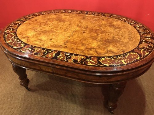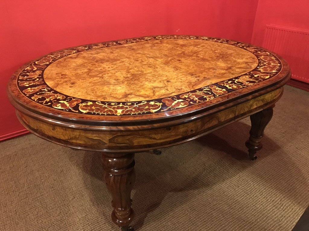 There is no mistaking the classic and sophisticated design of this exquisite oval burr walnut dining room table with fabulous marquetry inlaid decoration.