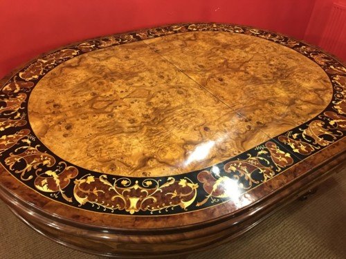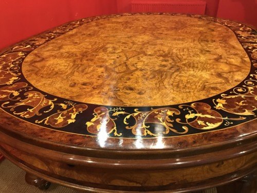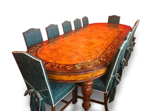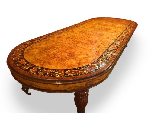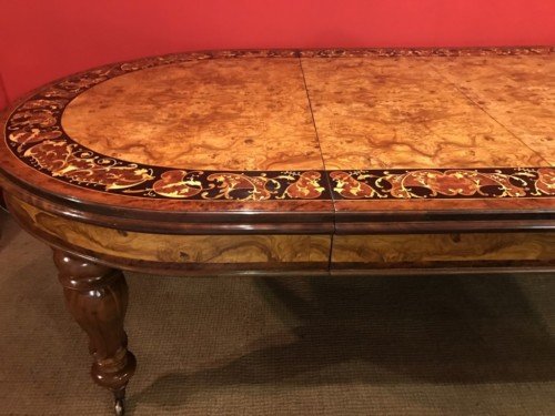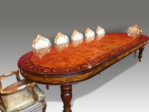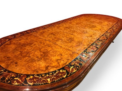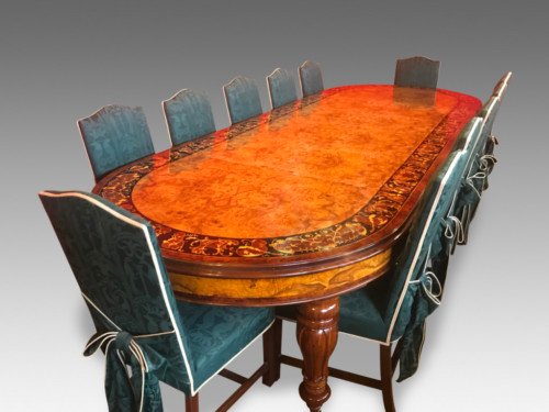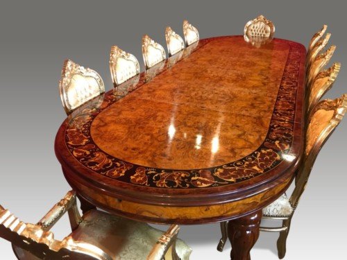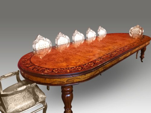 There is no mistaking the classic and sophisticated design of this exquisite oval burr walnut dining room table with fabulous marquetry inlaid decoration. This stunning table can comfortably seat 14 plus, and is also appropriate for a conference room. Whatever its function, it will make a profound impression on your dinner guests or clients and will receive the maximum amount of attention wherever it is placed.