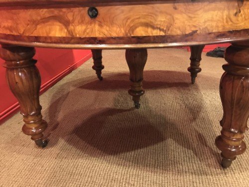 It has four leaves, which can added or removed as required to suit the occasion by a special winding mechanism. Five elegantly carved legs terminate in brass cap castors.