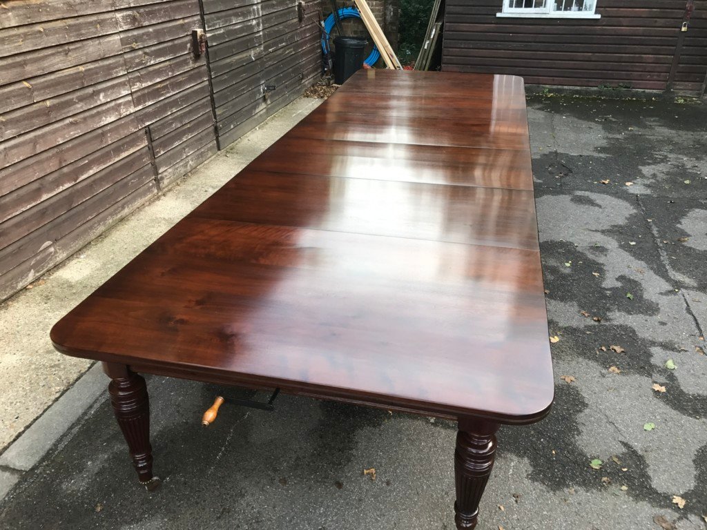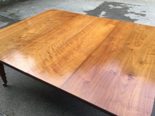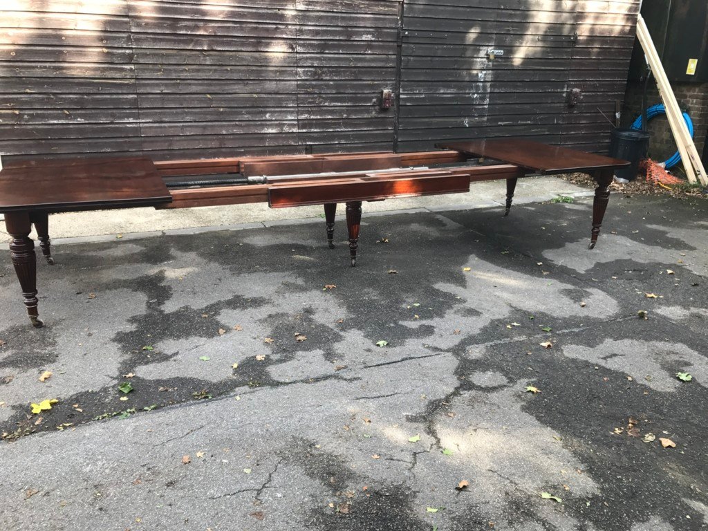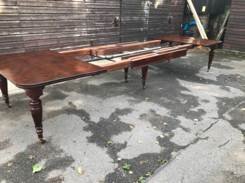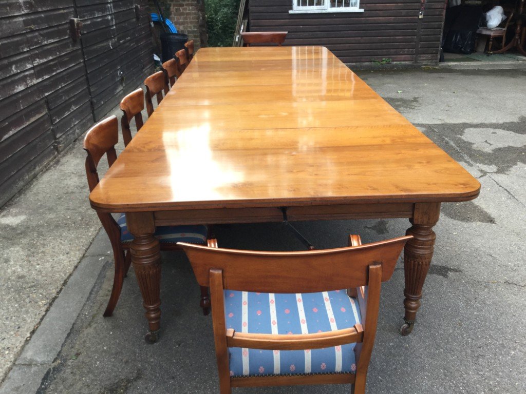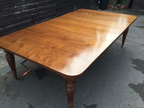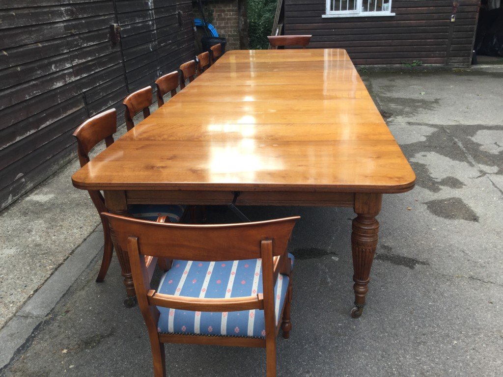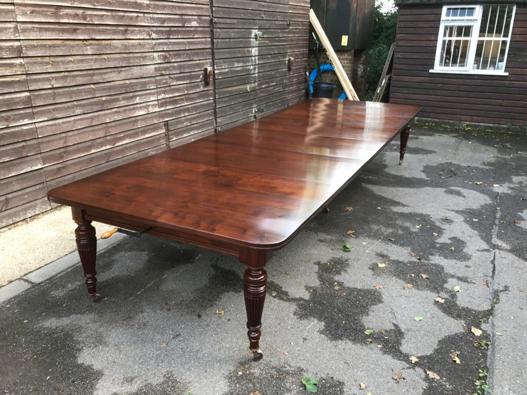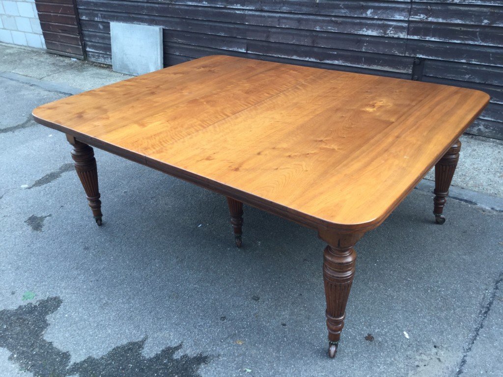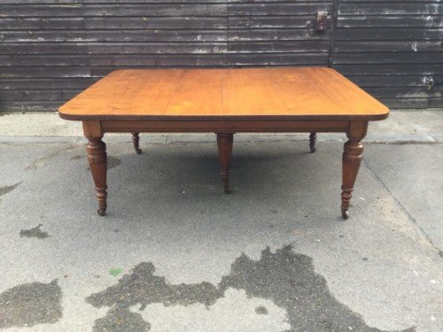 The Victorians introduced Walnut dining tables that extended by means of a cranking action and a mechanism of interlocking bearers that did away with the need for excessive numbers of legs: