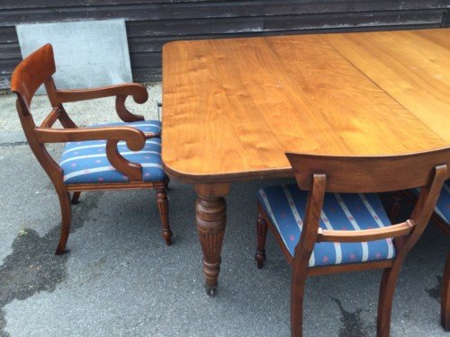 The chairs in the photos which would match the table superbly when hand French Polished to match the colour of the Dining table are available to purchase with your choice of colour upholstery, although the upholstery already fitted is in very good condition.