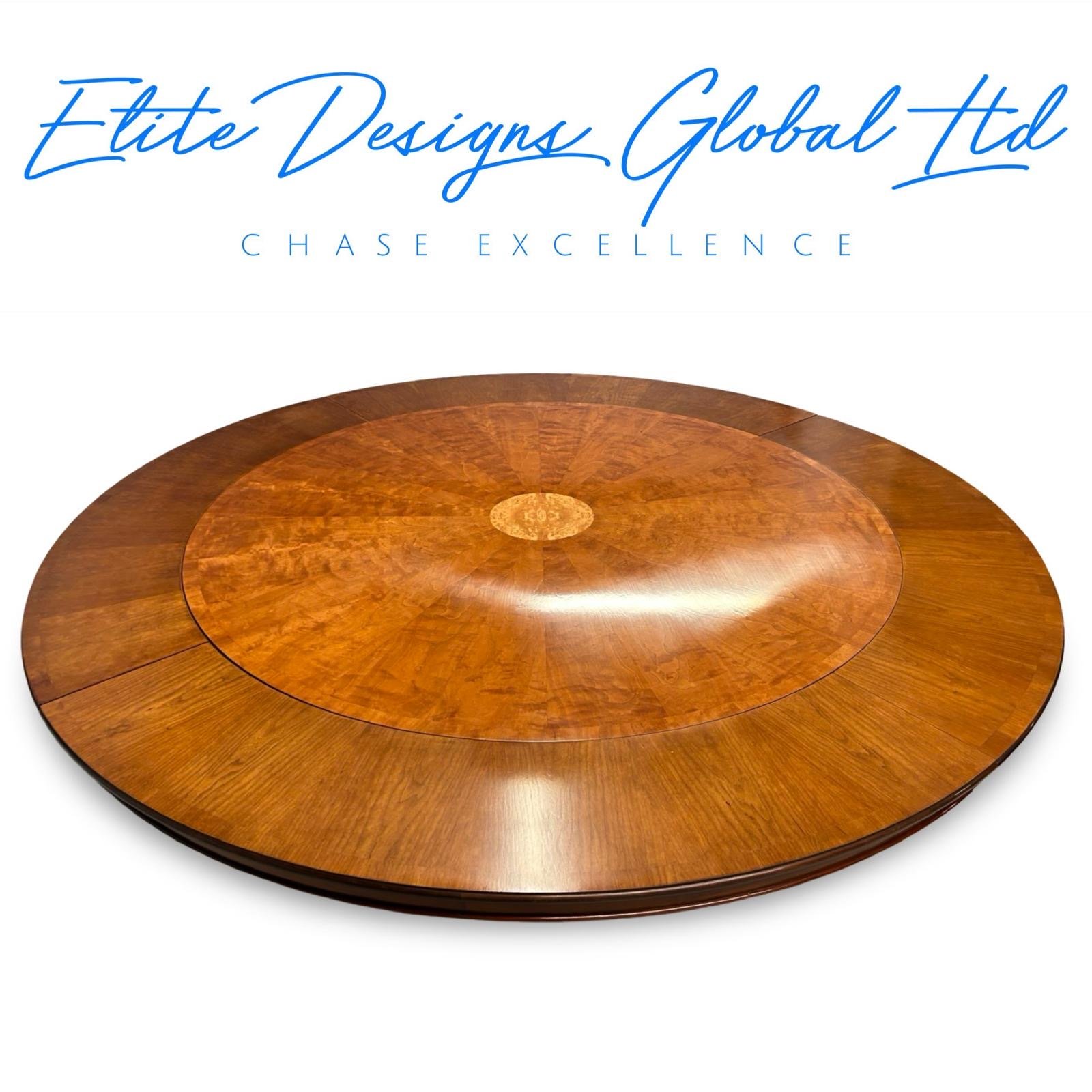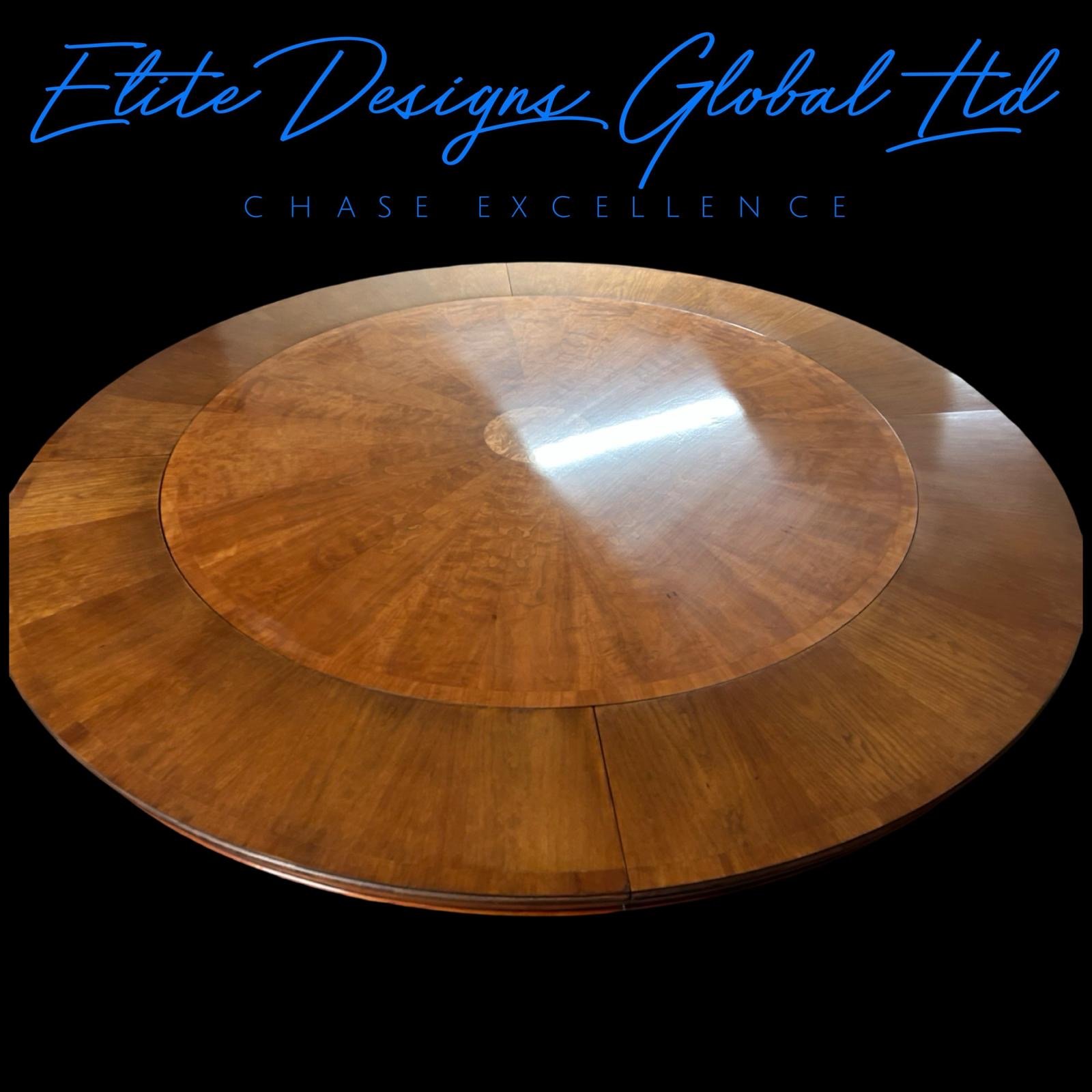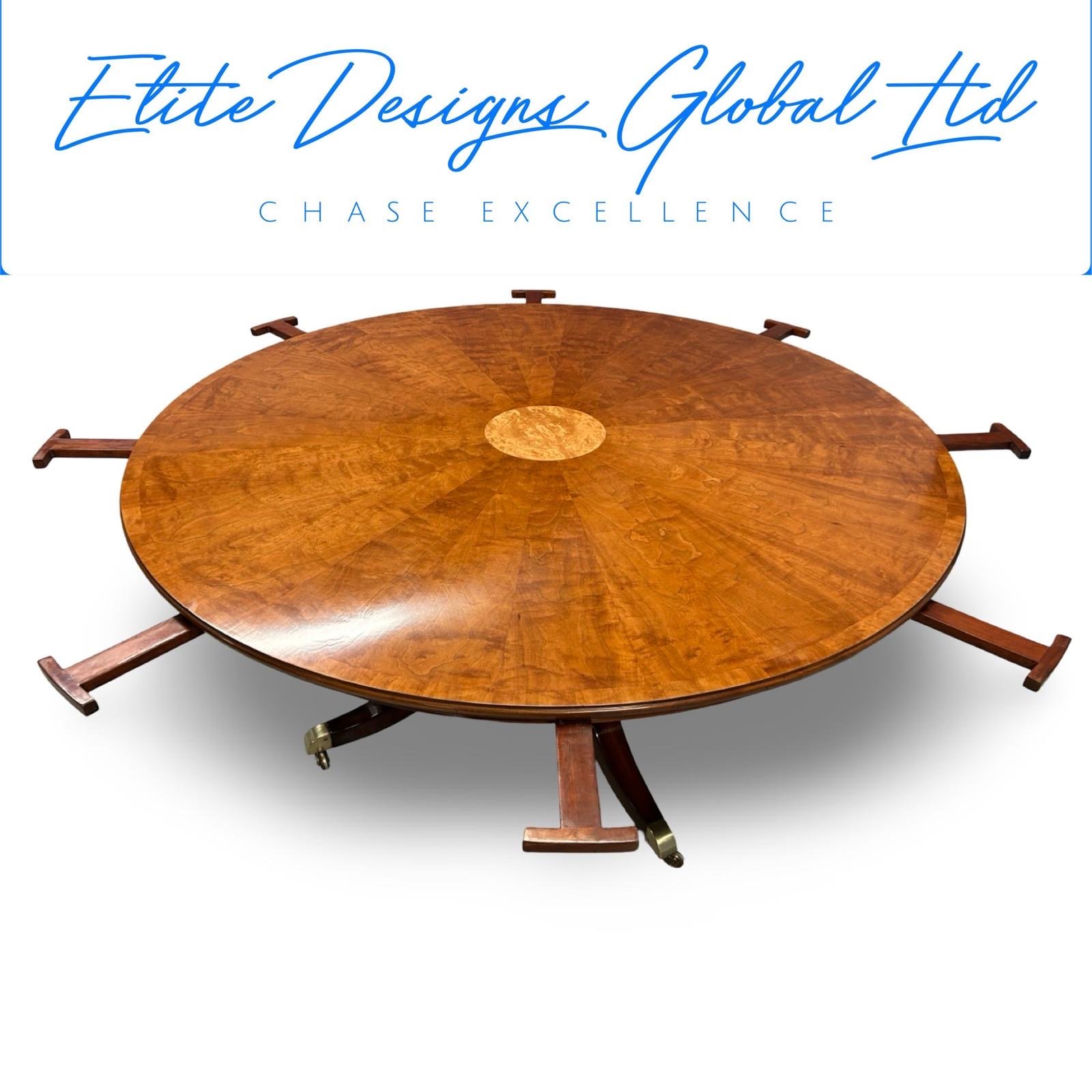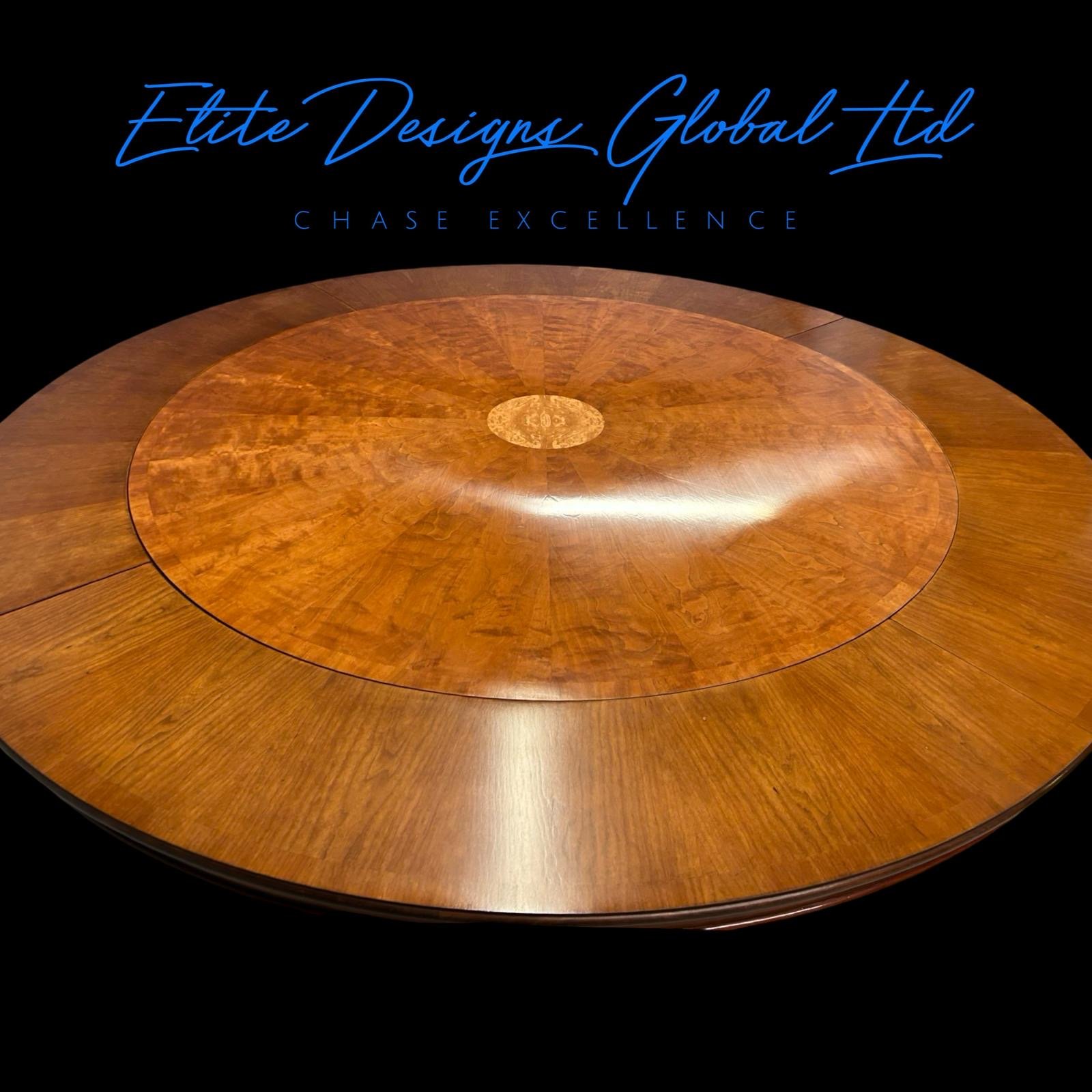 An exceptional and opulent 7.5ft Jupe Designer Art Deco style circular extending dining table, crafted in Cherry and Burr Ash, complete with 8 matching dining chairs.