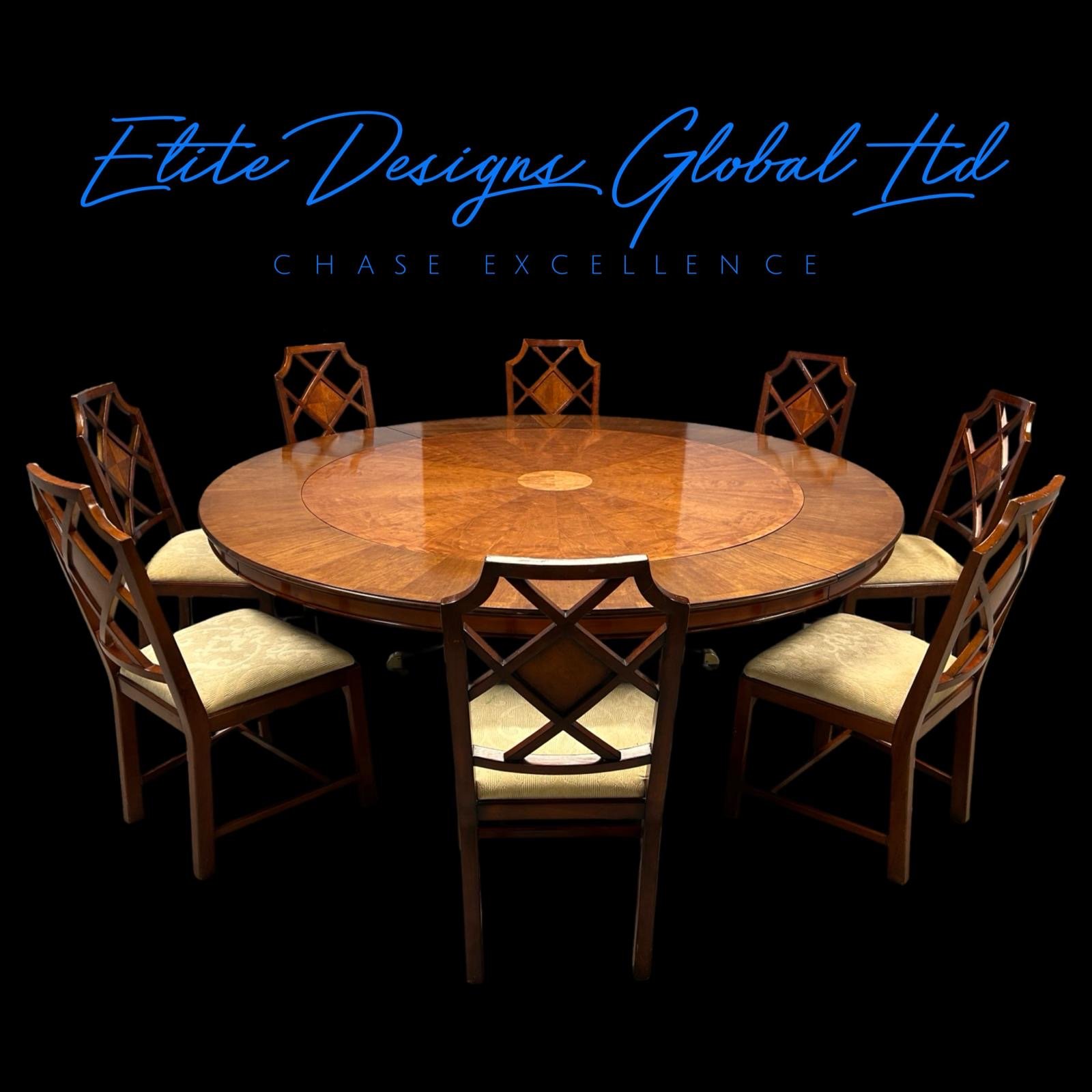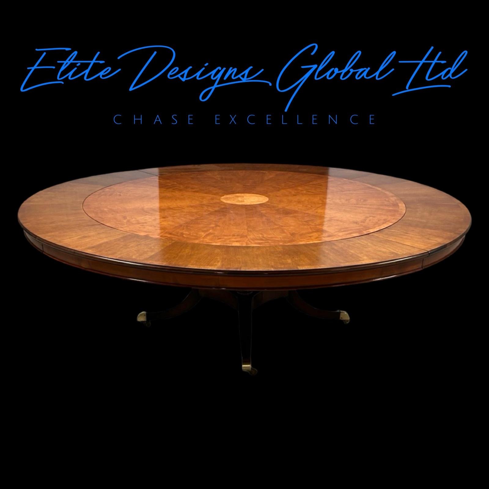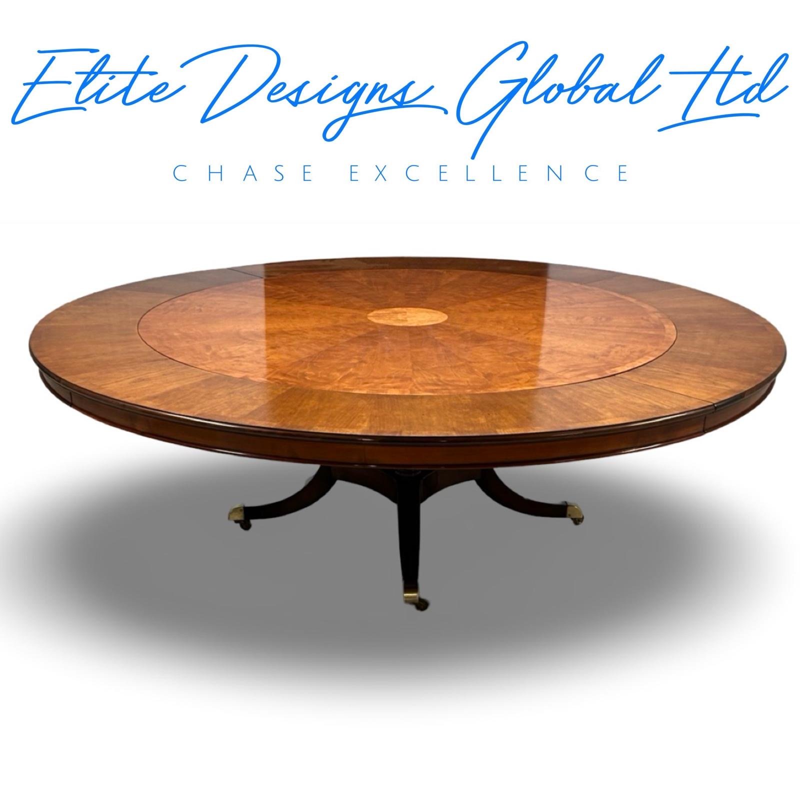 An exceptional and opulent 7.5ft Jupe Designer Art Deco style circular extending dining table, crafted in Cherry and Burr Ash, complete with 8 matching dining chairs.