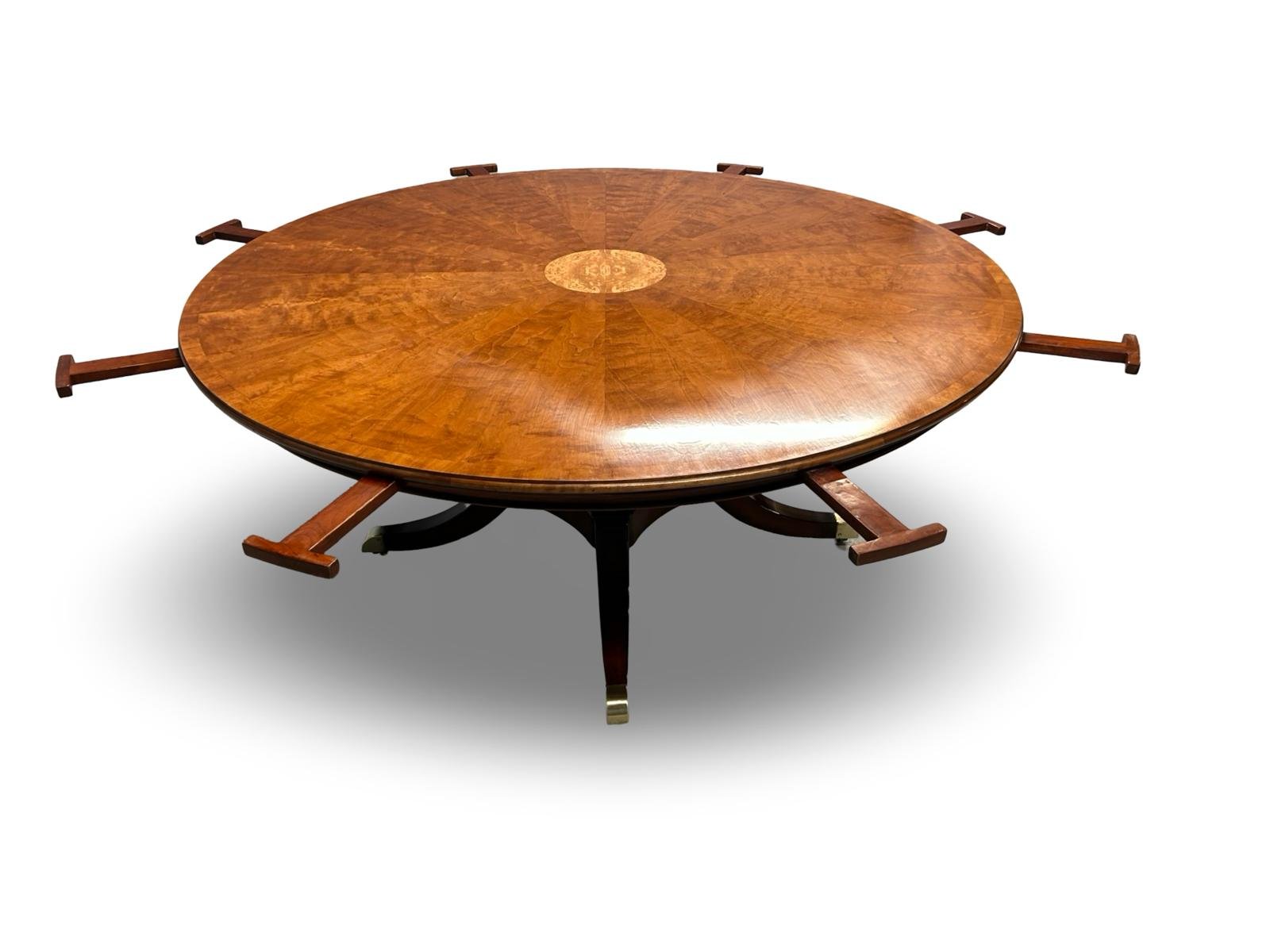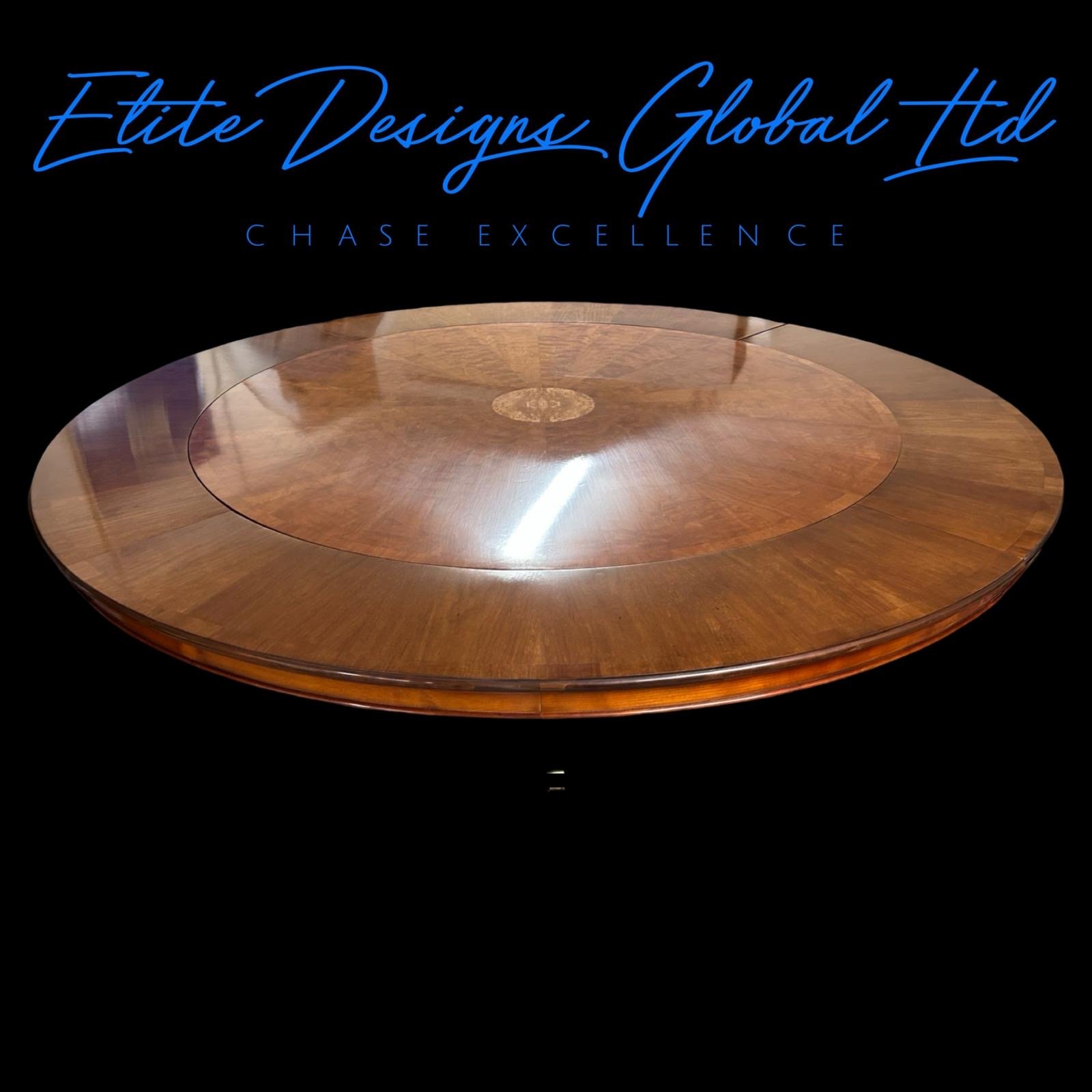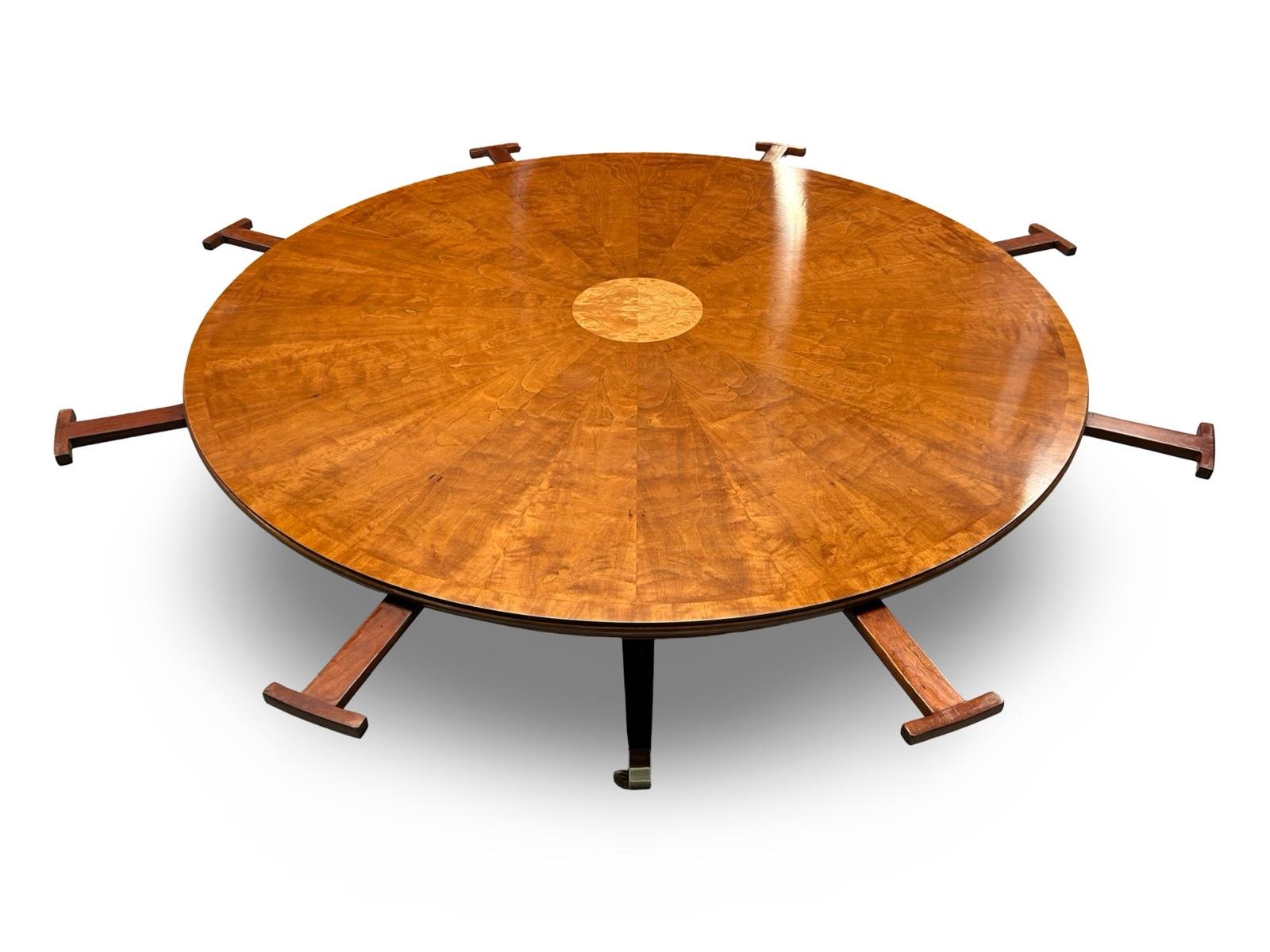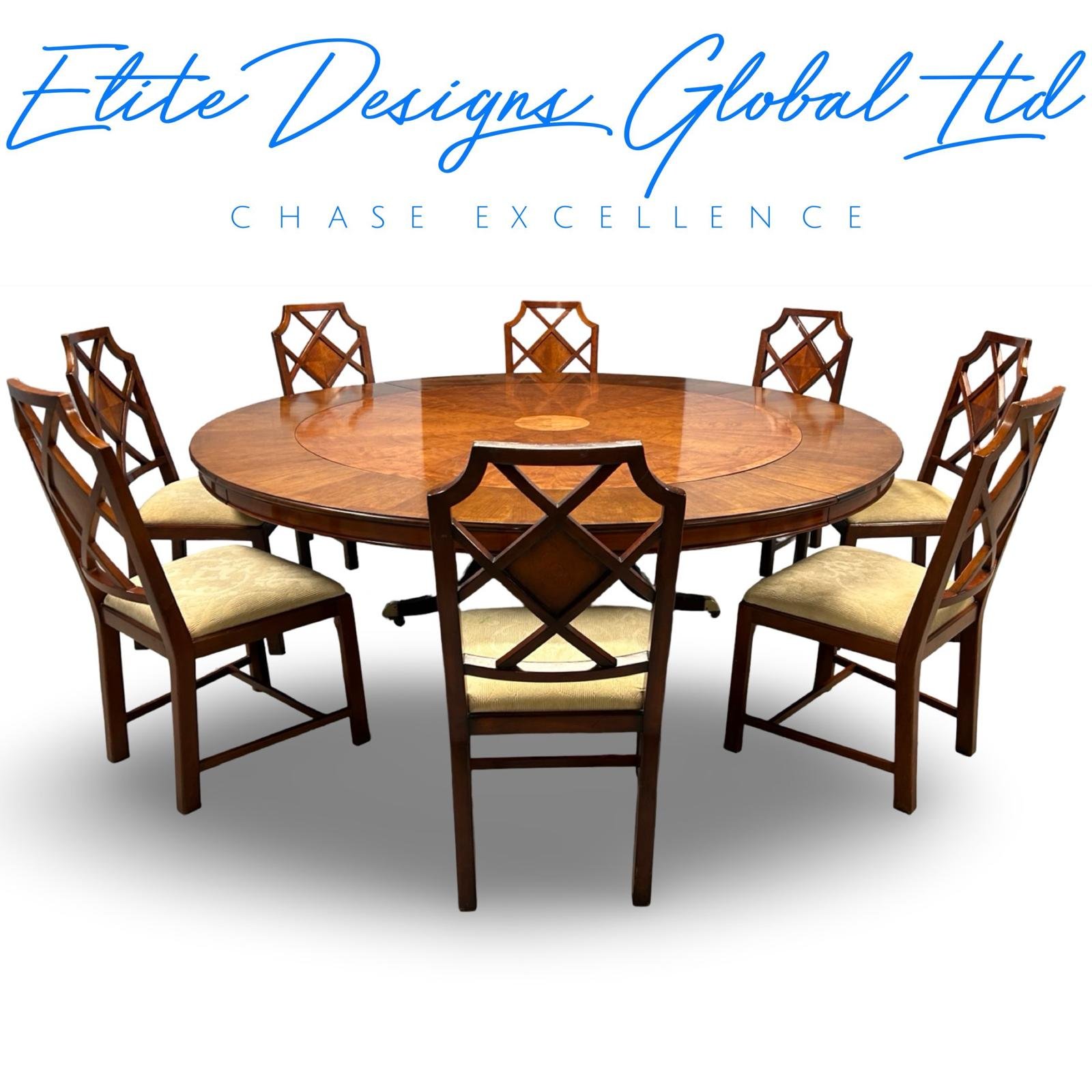 An exceptional and opulent 7.5ft Jupe Designer Art Deco style circular extending dining table, crafted in Cherry and Burr Ash, complete with 8 matching dining chairs.