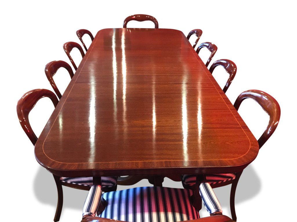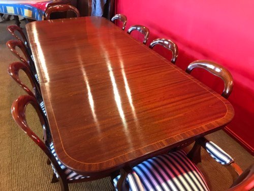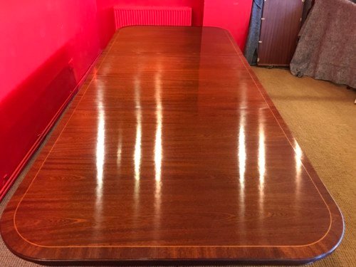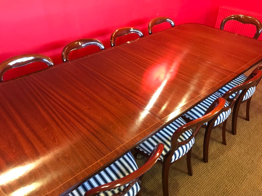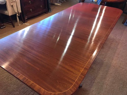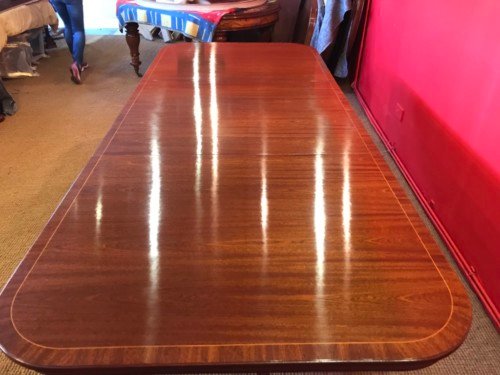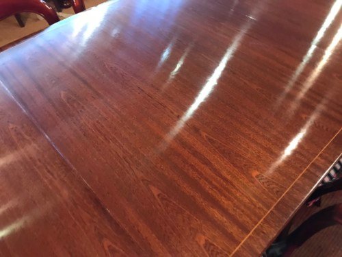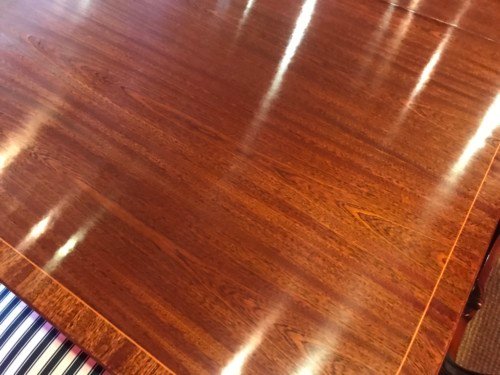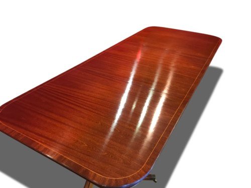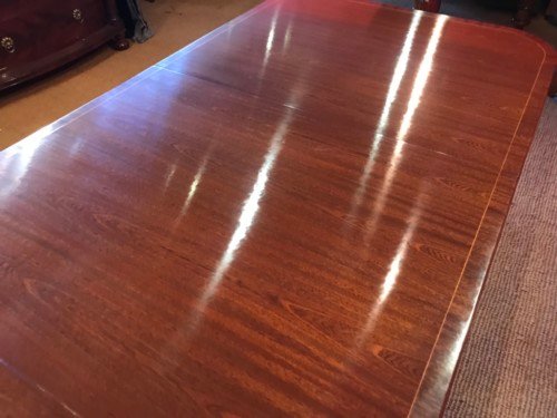 It’s just been professionally French polished in the traditional natural warm mahogany colour to show off the beautiful movement mahogany & will have once again that deep lustrous shine & gleam to it that still only hand French polishing can achieve using the very finest modern table top French Polishes & materials to obtain the stunning finish we desire, which also now give quite a hard & heat resistant finish compared to the old French Polishes of the past.