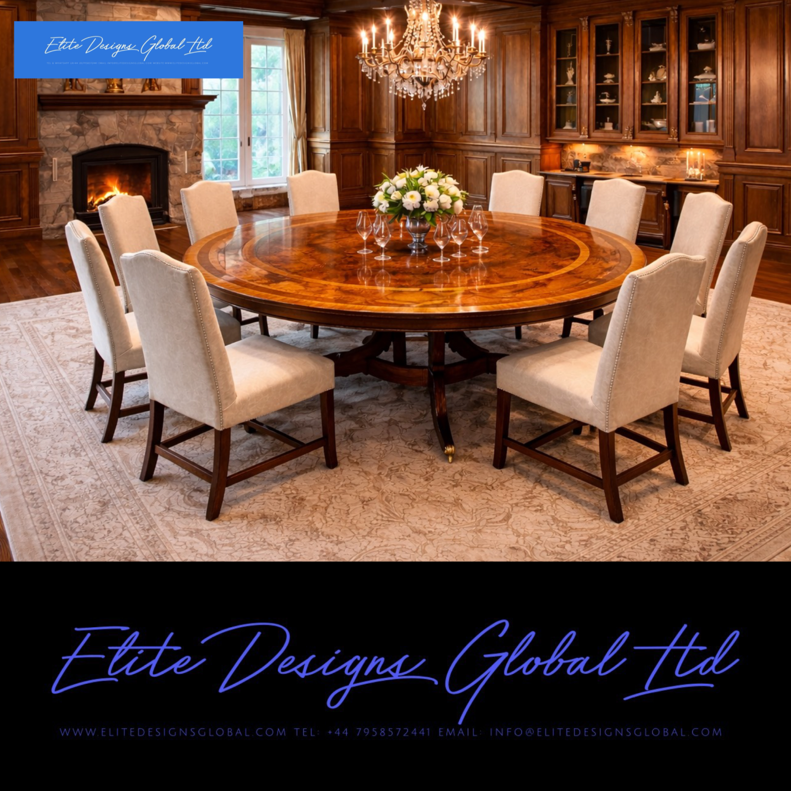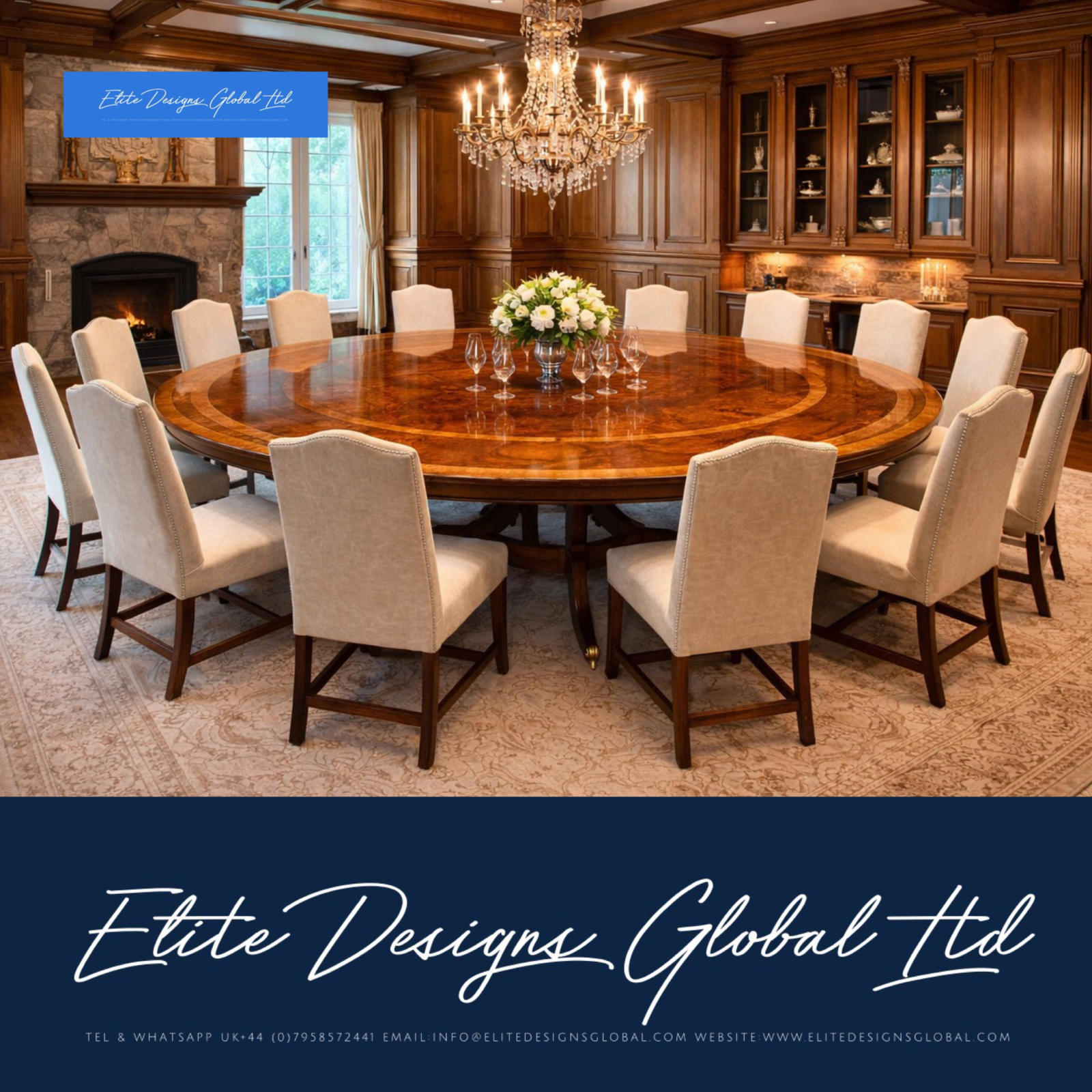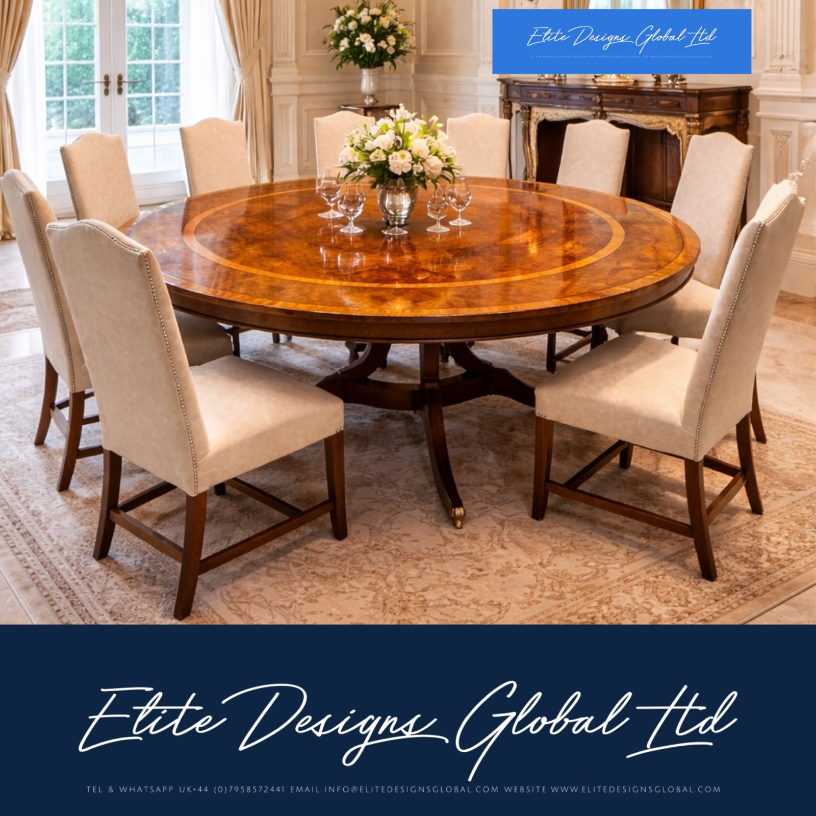 Elite Designs Global Ltd proudly presents a special commission Jupe-style extending circular dining table — a magnificent, opulent, and versatile centrepiece for any luxury interior.