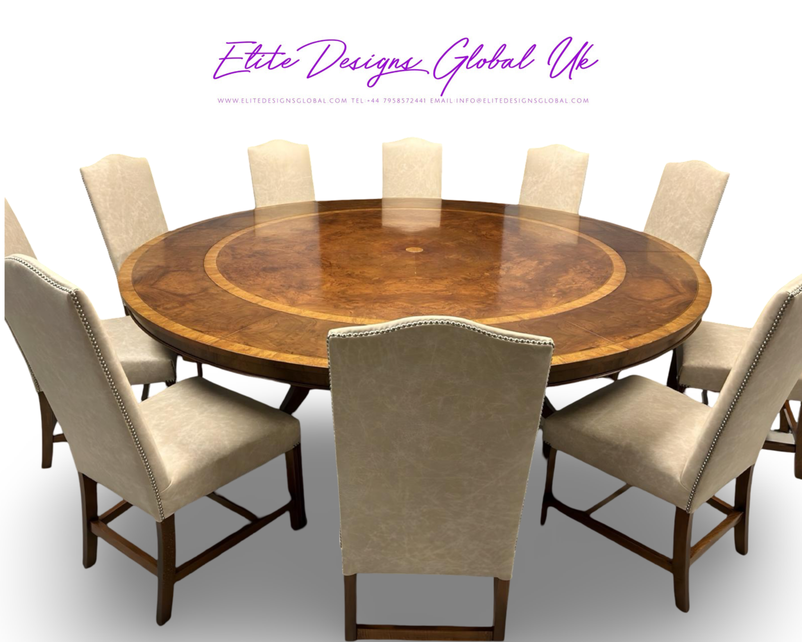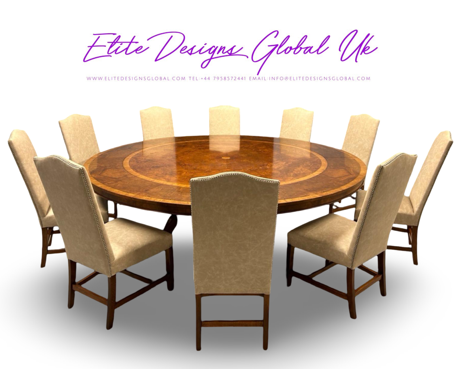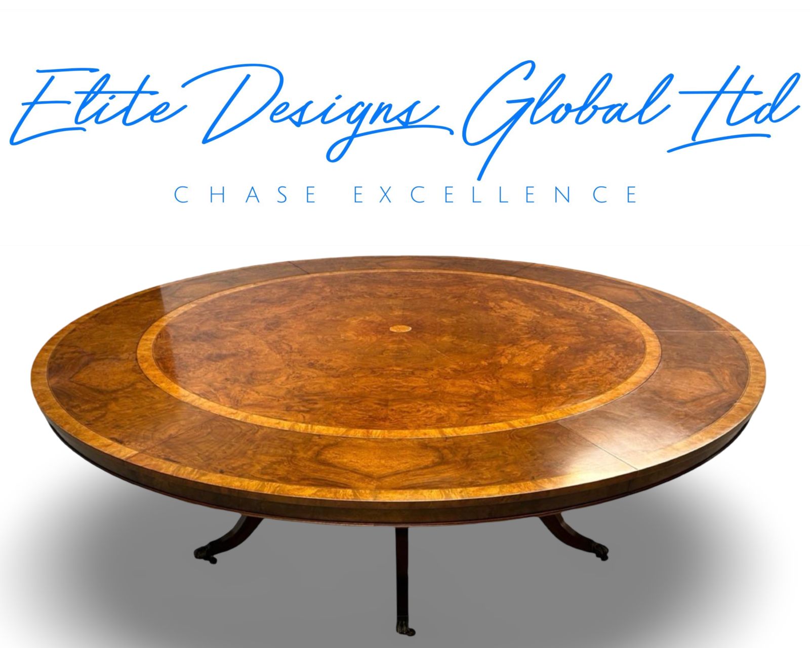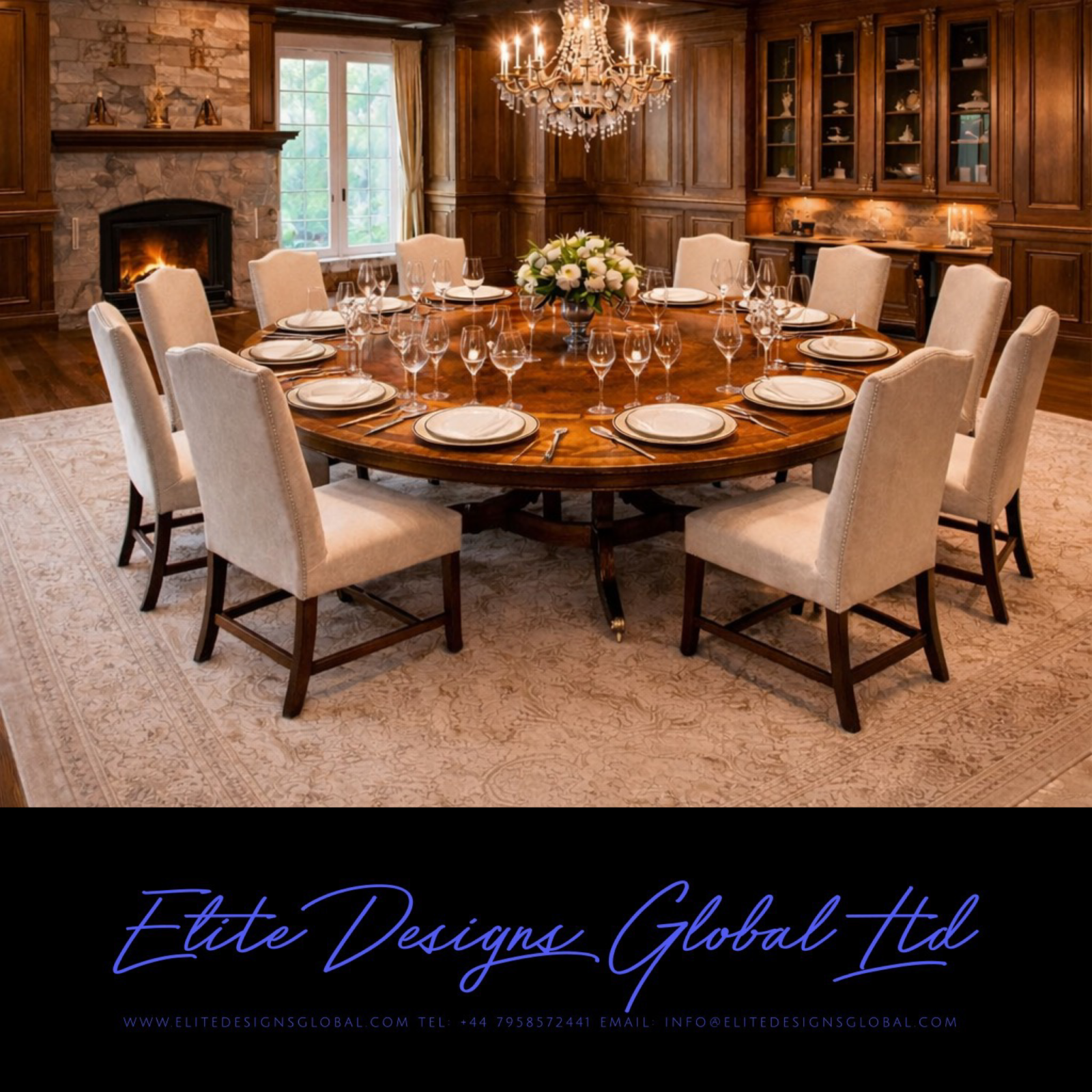 Elite Designs Global Ltd proudly presents a special commission Jupe-style extending circular dining table — a magnificent, opulent, and versatile centrepiece for any luxury interior.