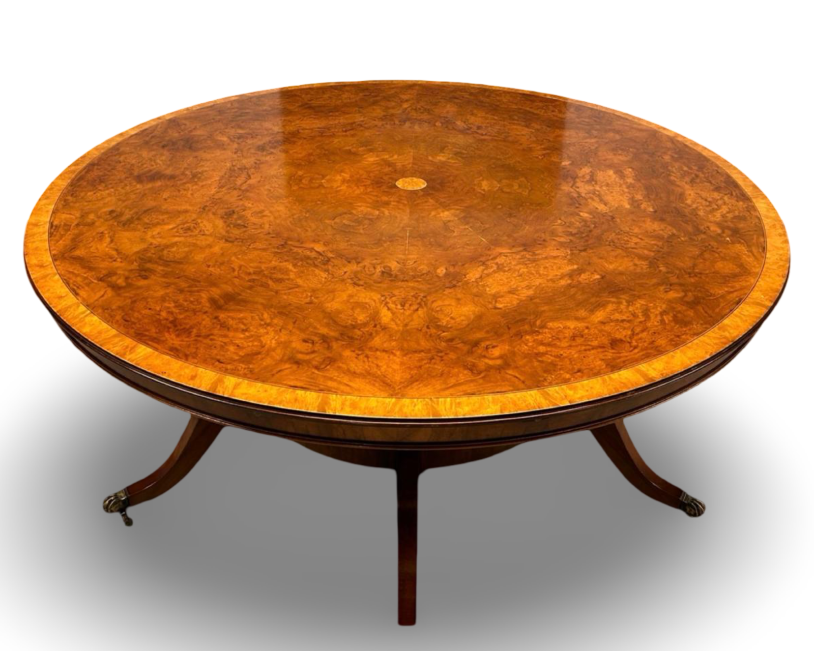 This Burr Walnut Jupe table has been hand-crafted by our master cabinetmakers and is to be professionally French polished by our in-house team (over £1500 in polishing works alone). The result is a table that oozes sophistication, grandeur, and timeless design, comfortably seating up to 12 guests.