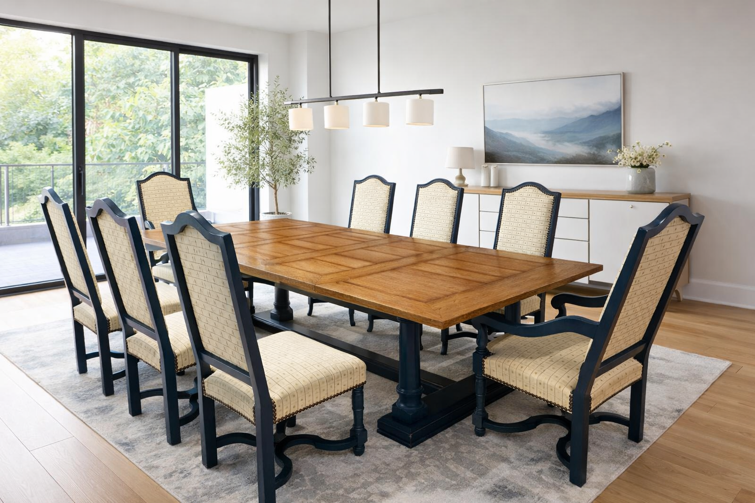 The set includes eight solid oak dining chairs, all finished to match the table in Farrow & Ball Hague Blue. These chairs are not only visually striking but also substantial, heavy, and comfortable.