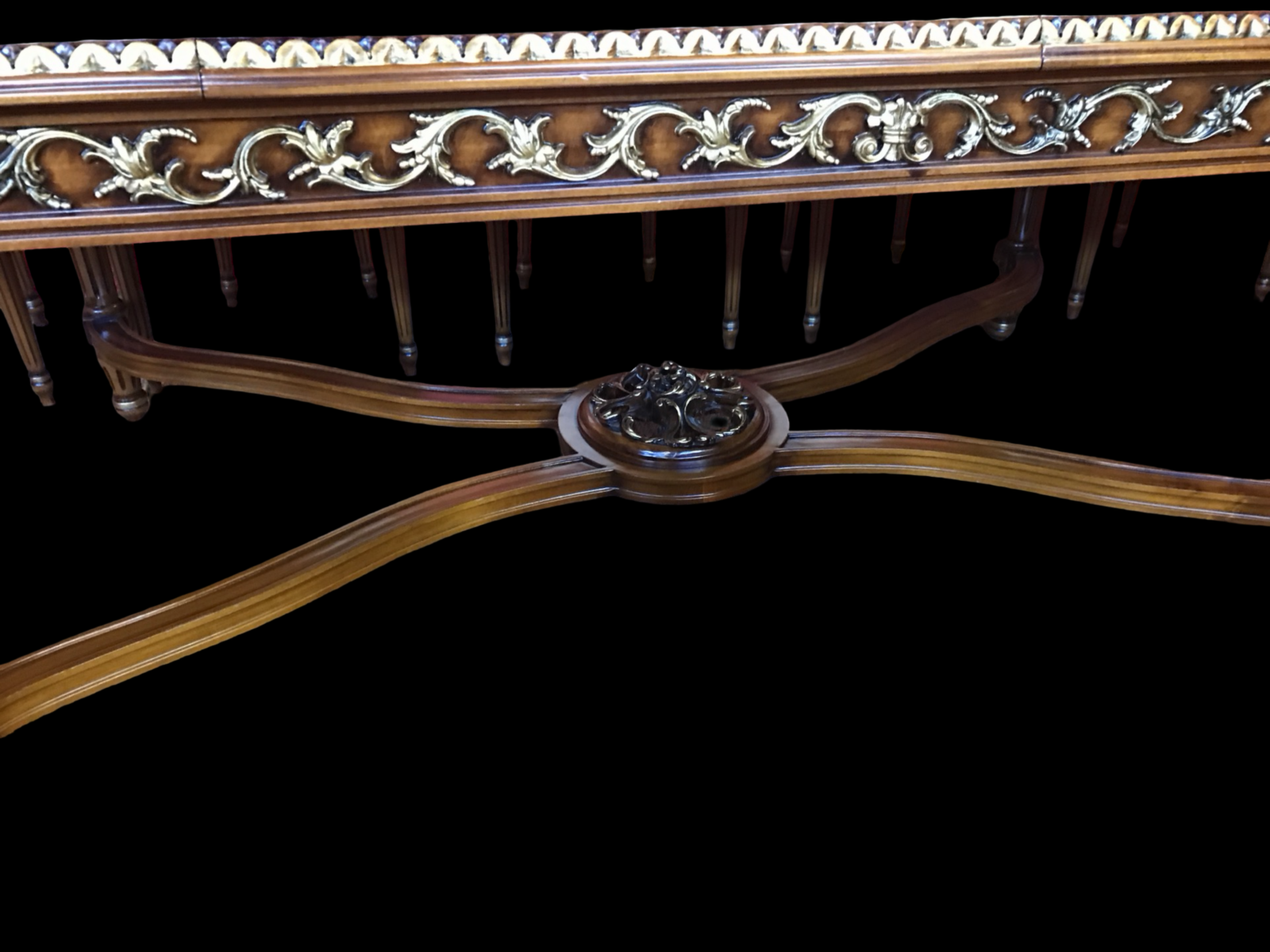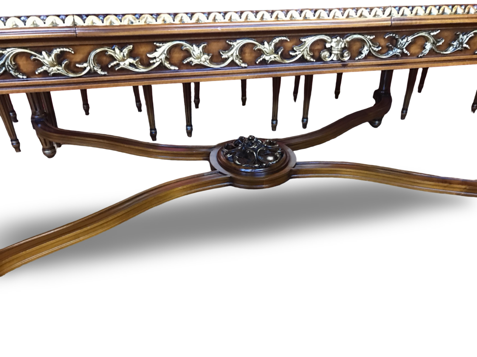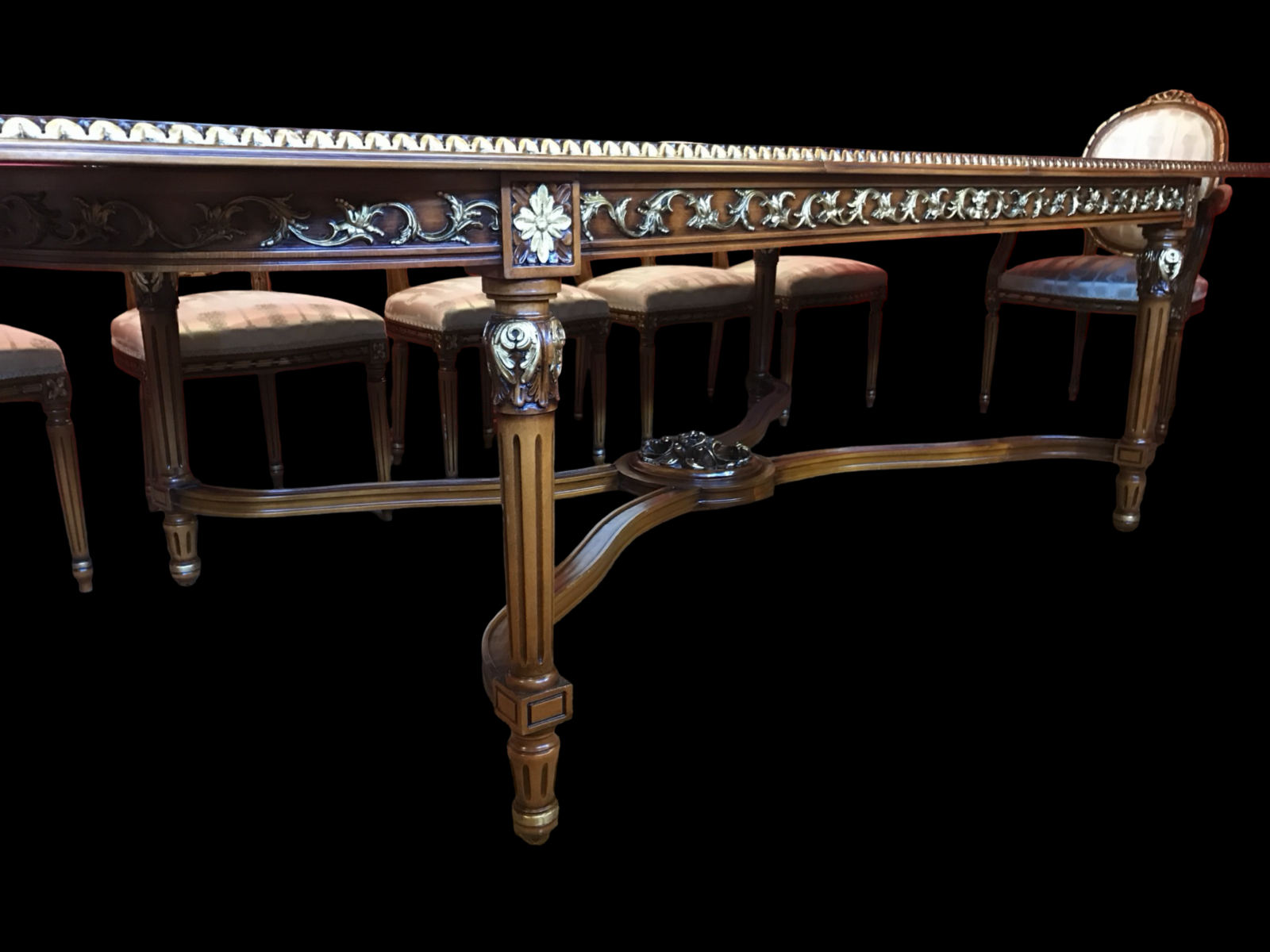 Designed in a refined Regency / Louis transitional style, the table combines classical elegance with architectural structure — resulting in a dining table that is both grand and beautifully balanced.