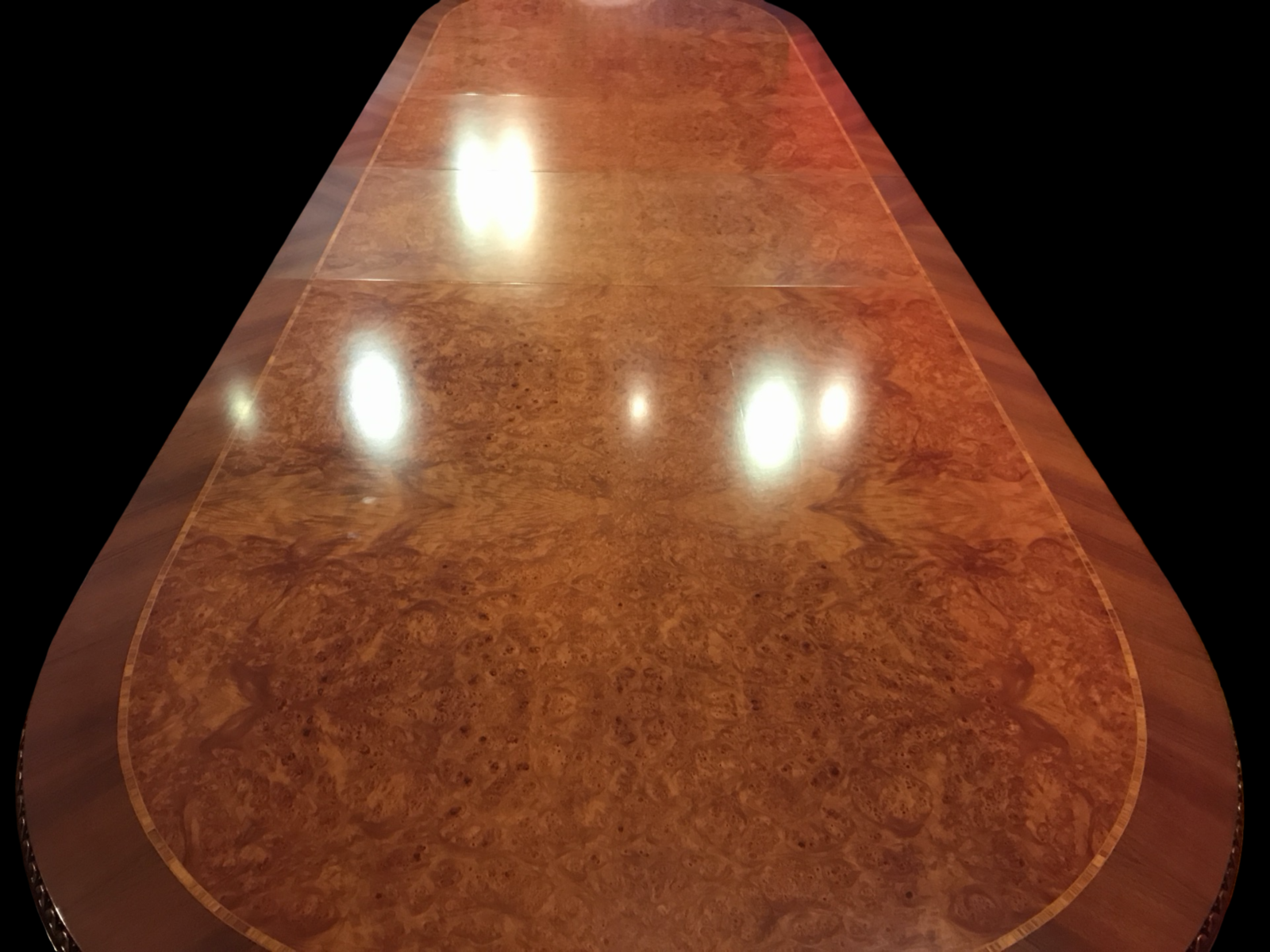 A truly magnificent, world-class Elite bespoke handcrafted Burr Walnut dining table of exceptional scale, beauty and craftsmanship.
