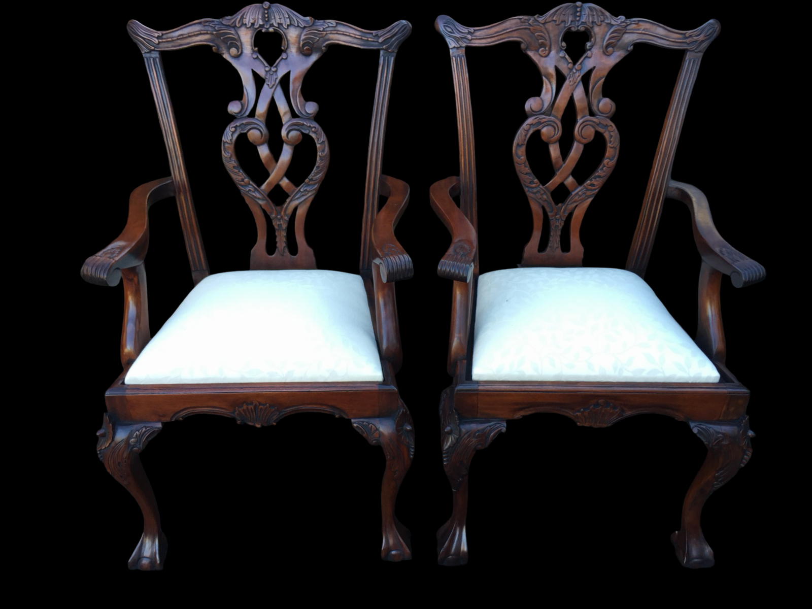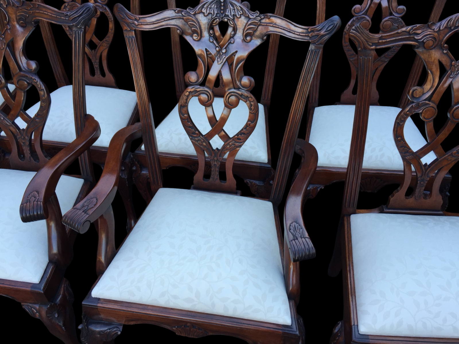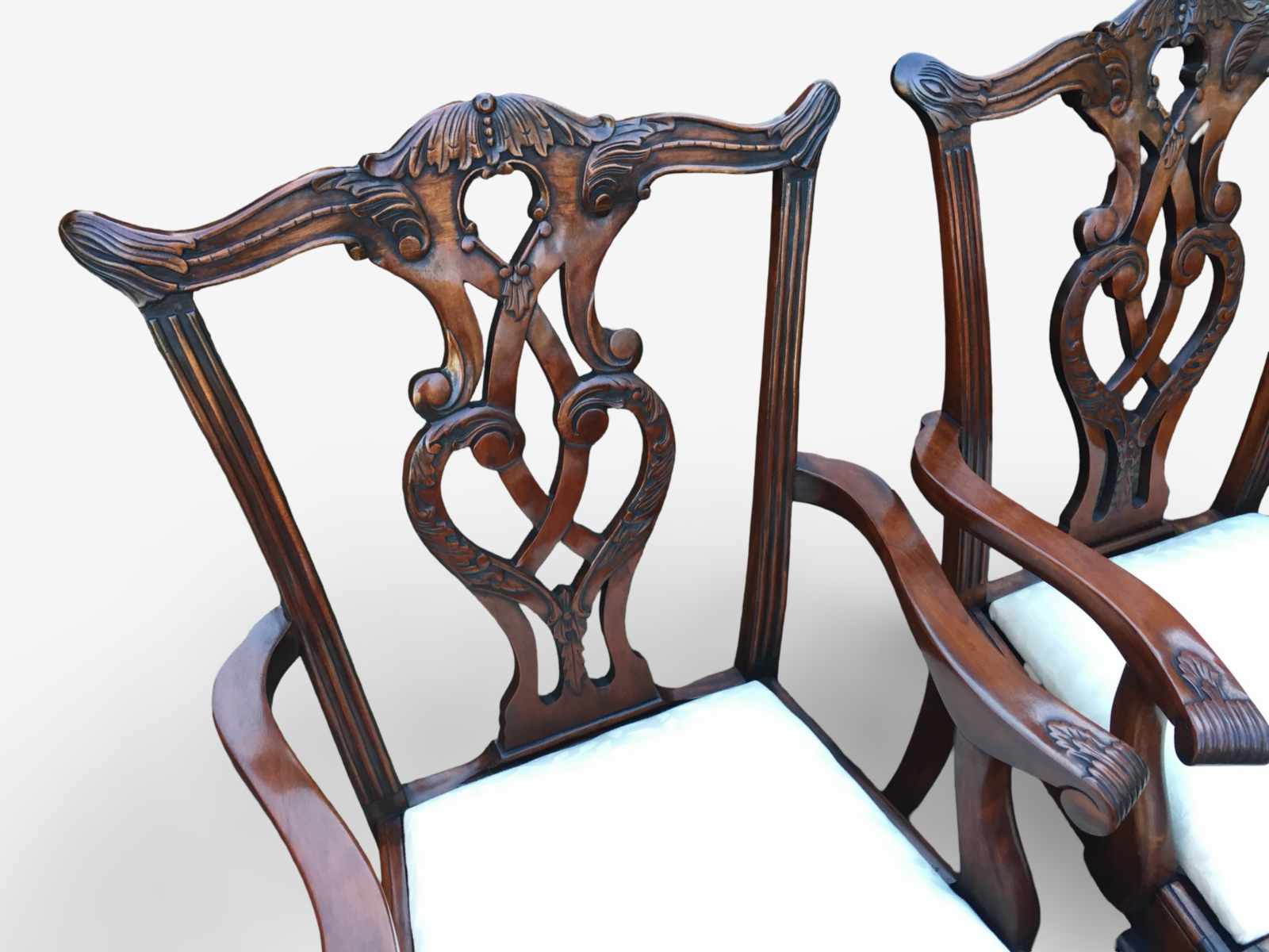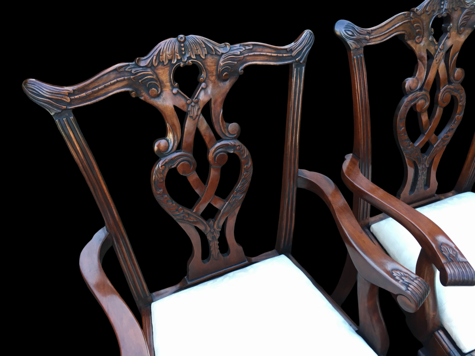 These chairs immediately impress with their graceful silhouette and depth of carving. The backs feature intricately pierced and carved splats, incorporating flowing scrollwork, acanthus detailing and elegant central motifs. The top rails are gently shaped with subtle carved accents, giving the chairs a refined yet commanding presence.