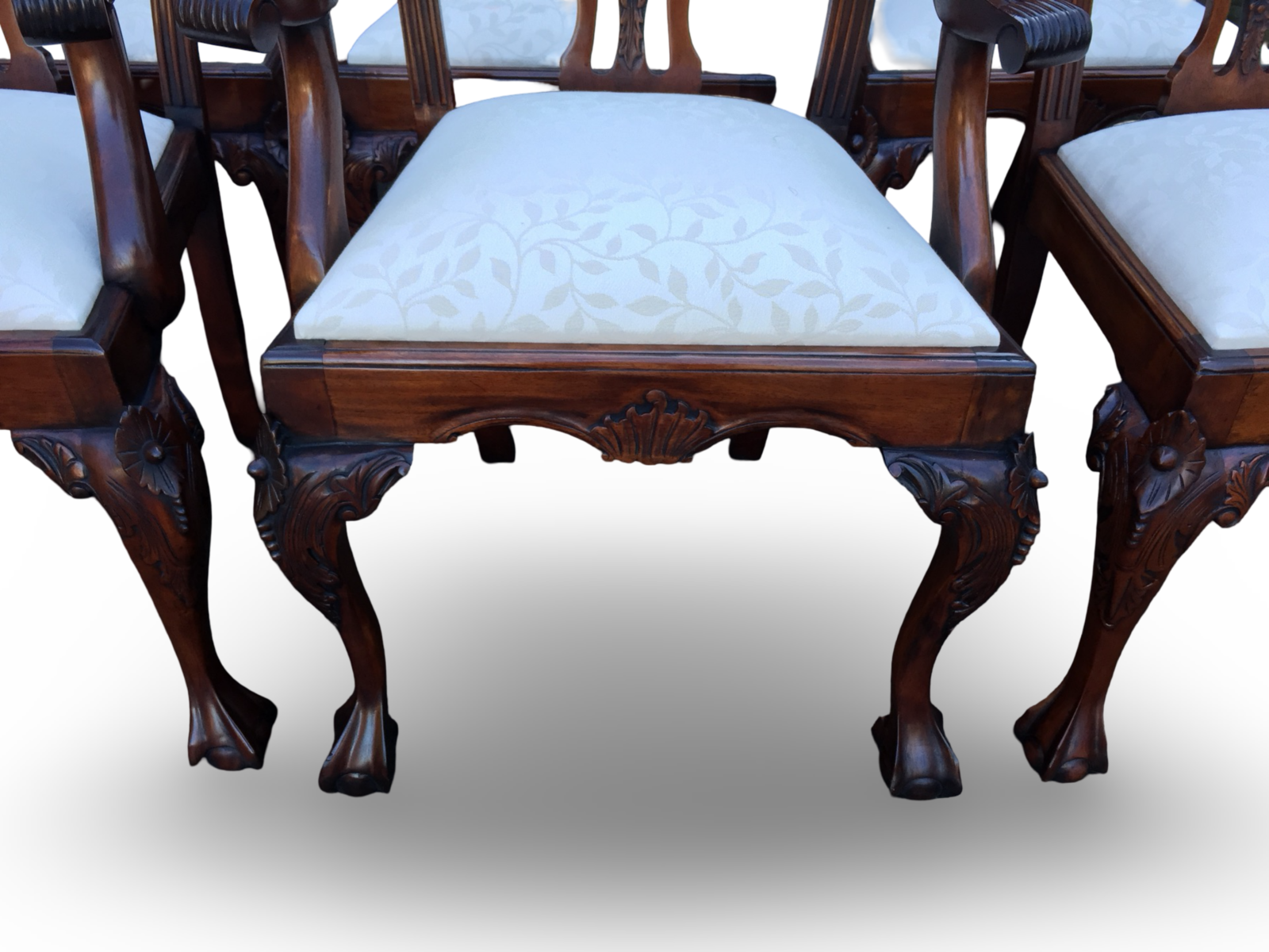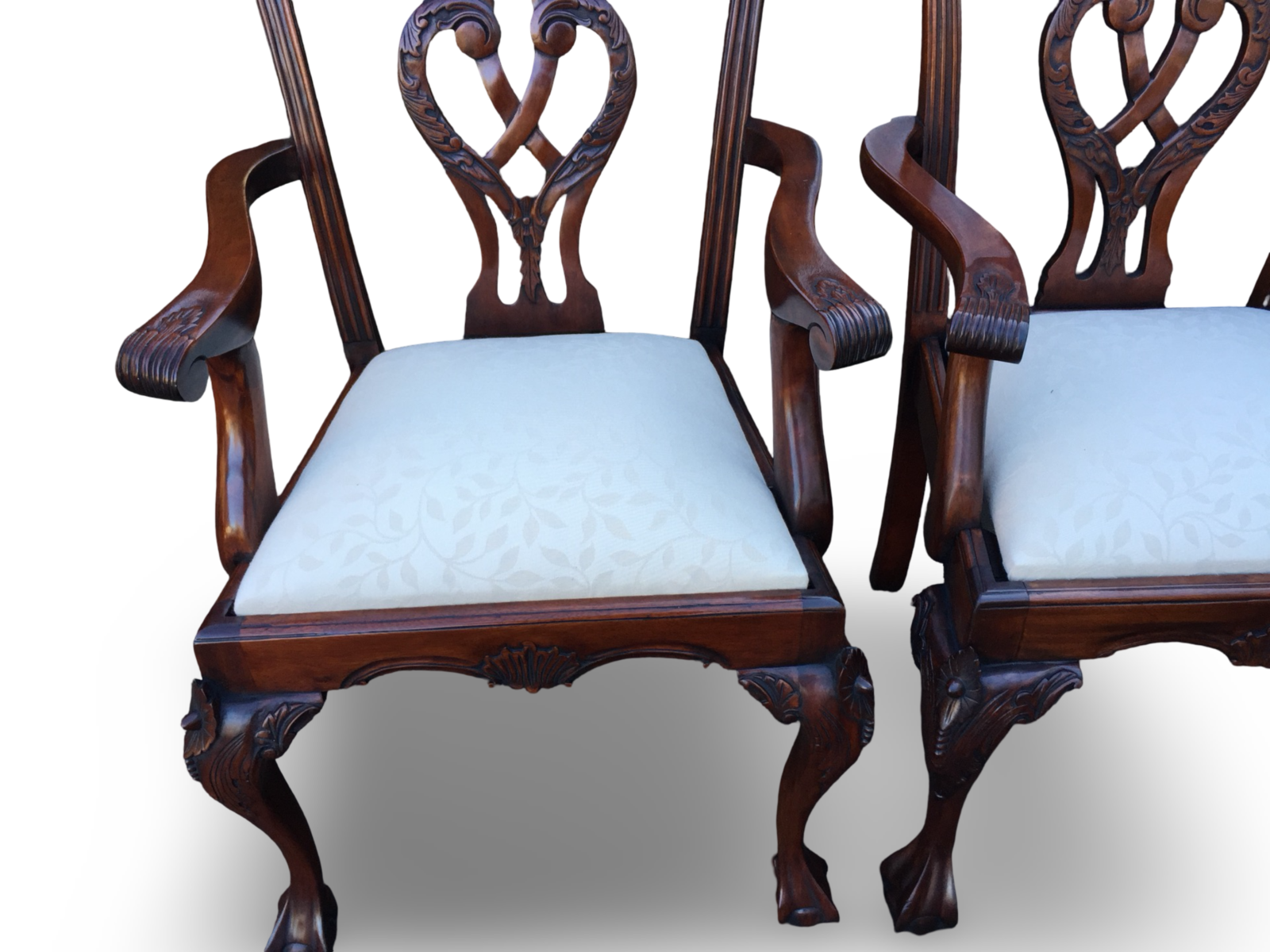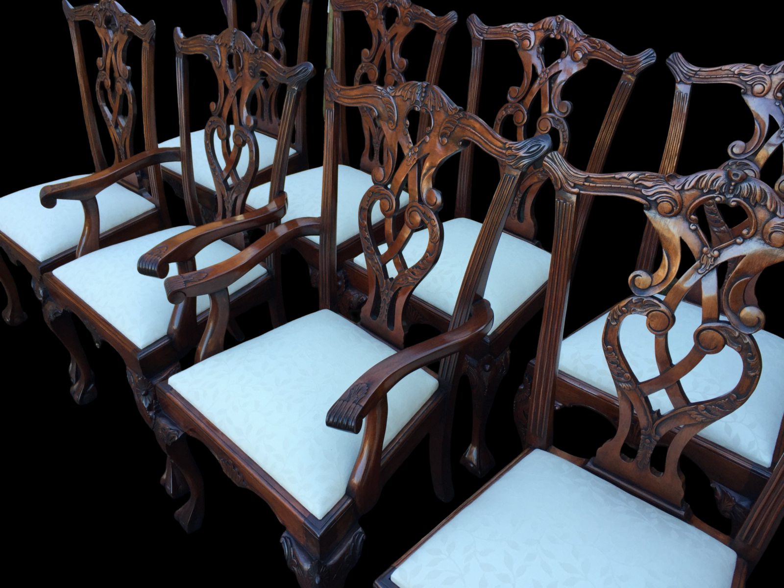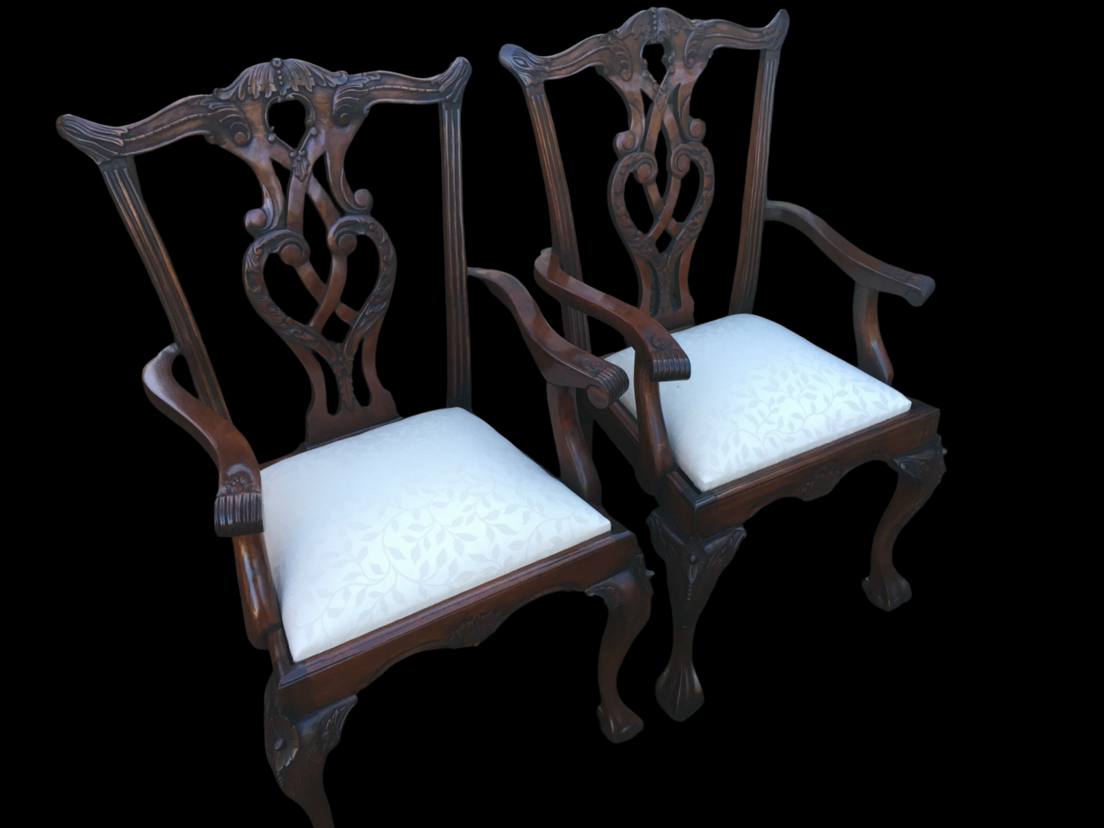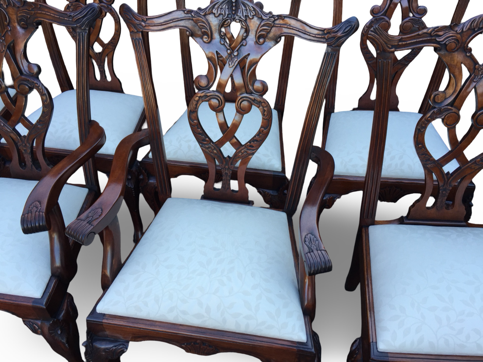 These chairs immediately impress with their graceful silhouette and depth of carving. The backs feature intricately pierced and carved splats, incorporating flowing scrollwork, acanthus detailing and elegant central motifs. The top rails are gently shaped with subtle carved accents, giving the chairs a refined yet commanding presence.