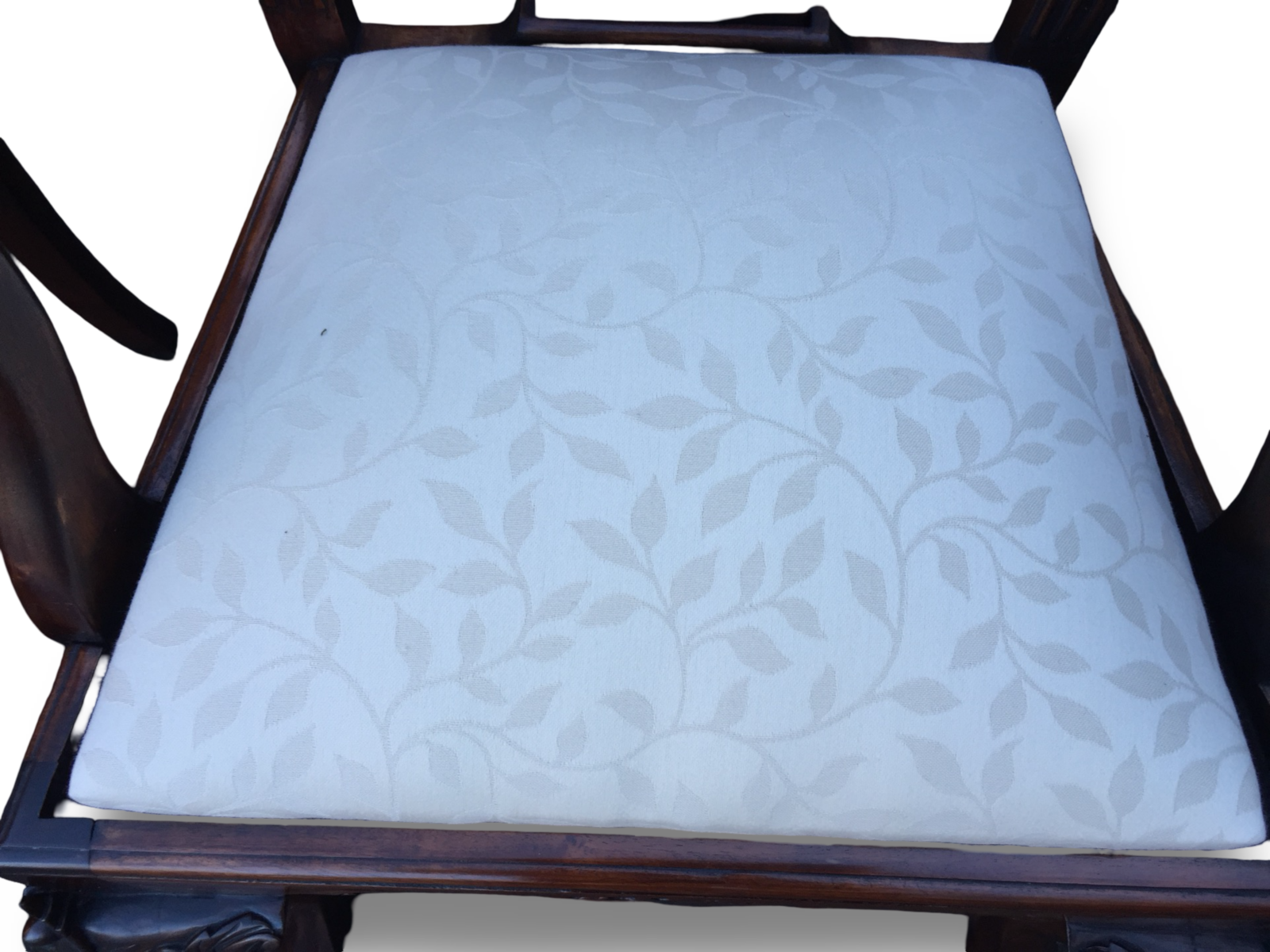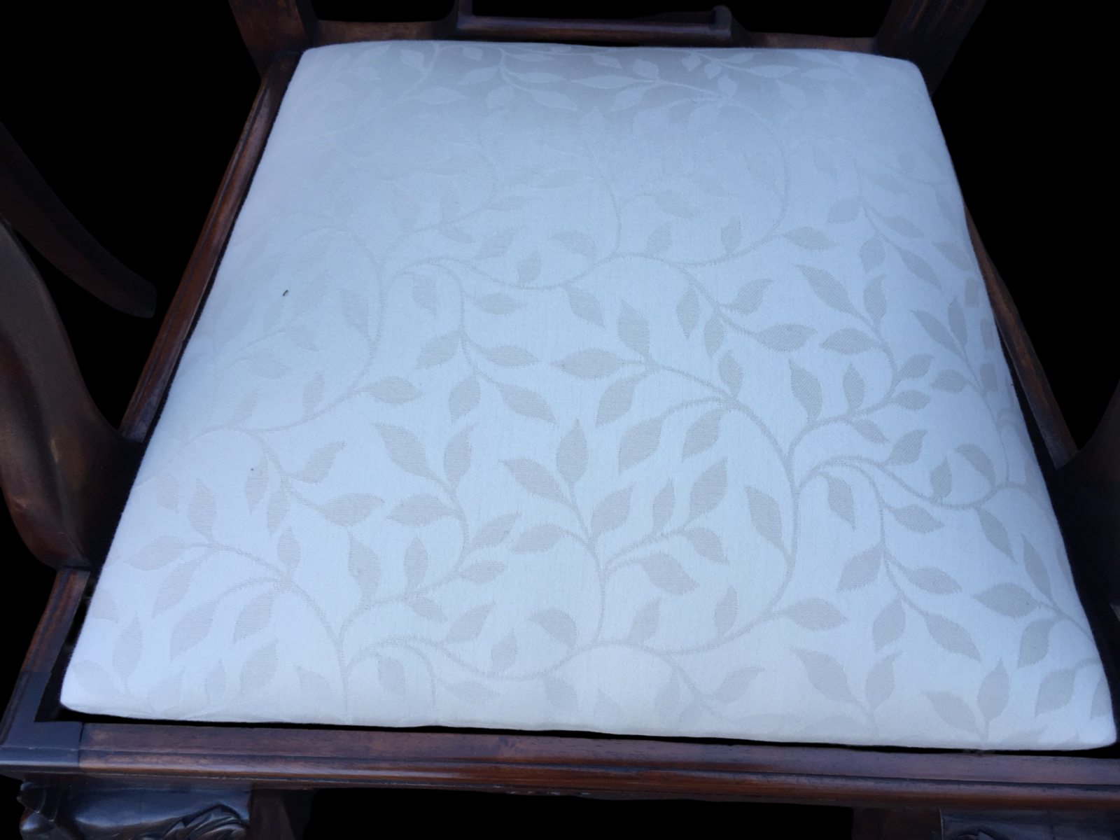 This elegant jacquard design has a soft, understated texture that catches the light gently without overpowering the carving of the chairs. The pattern is classic and timeless — delicate trailing foliage woven into the fabric rather than printed, giving it depth and quality.