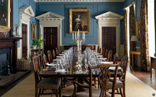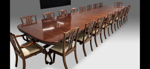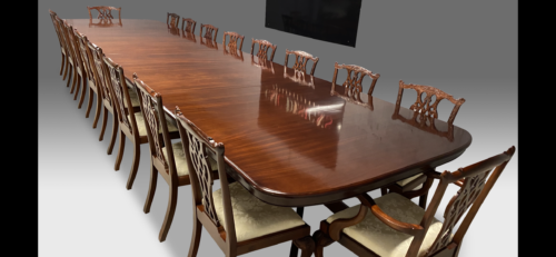 The table can come with the matching set of 18 Chippendale style dining chairs that are currently fitted with an Ivory damask fabric.