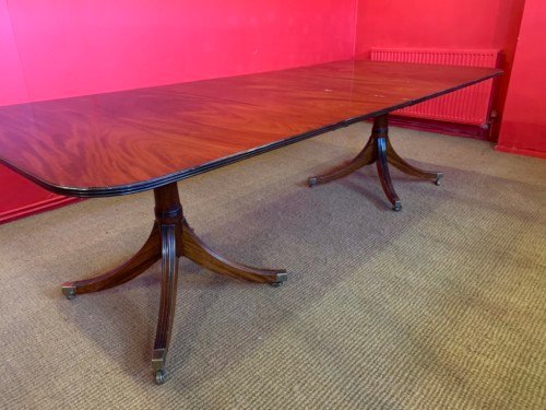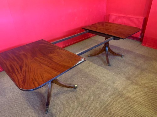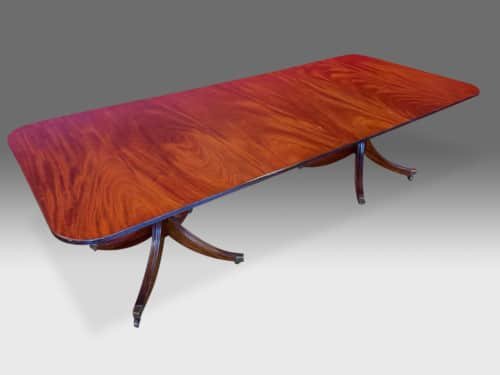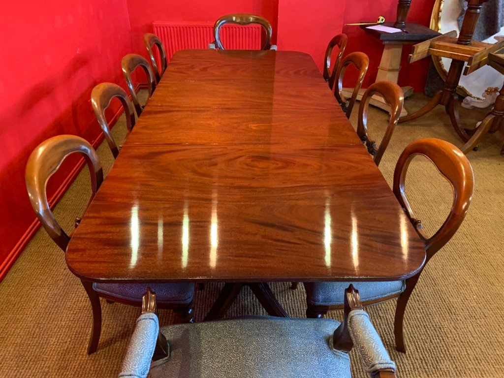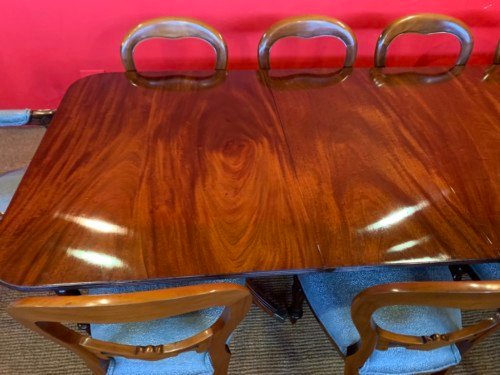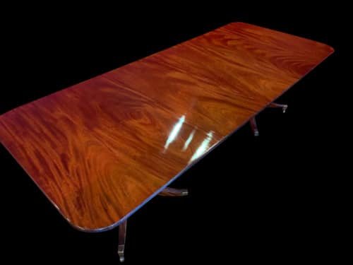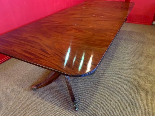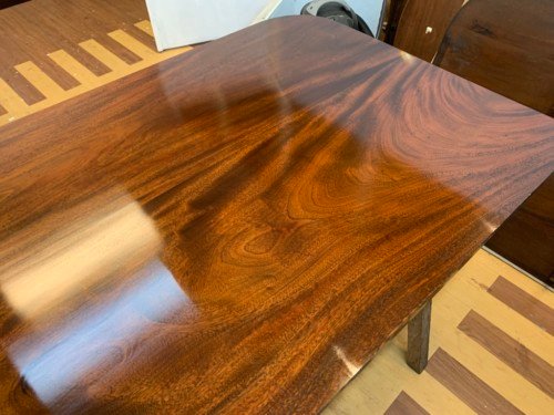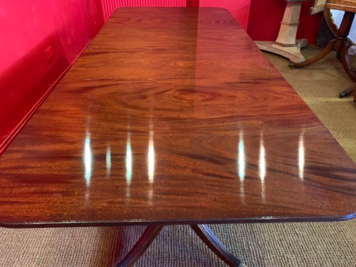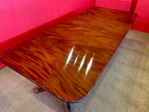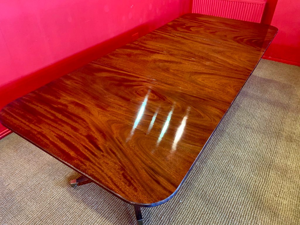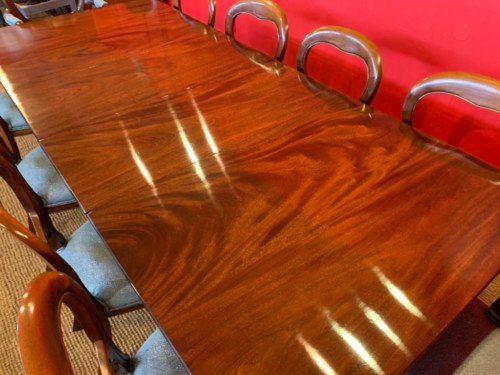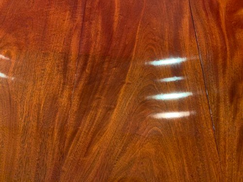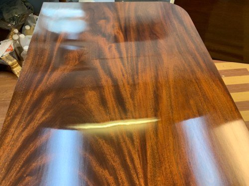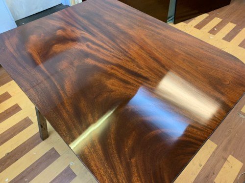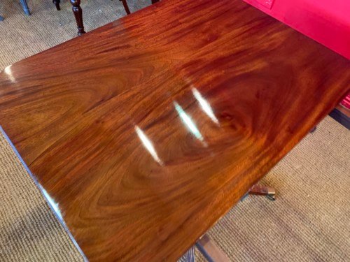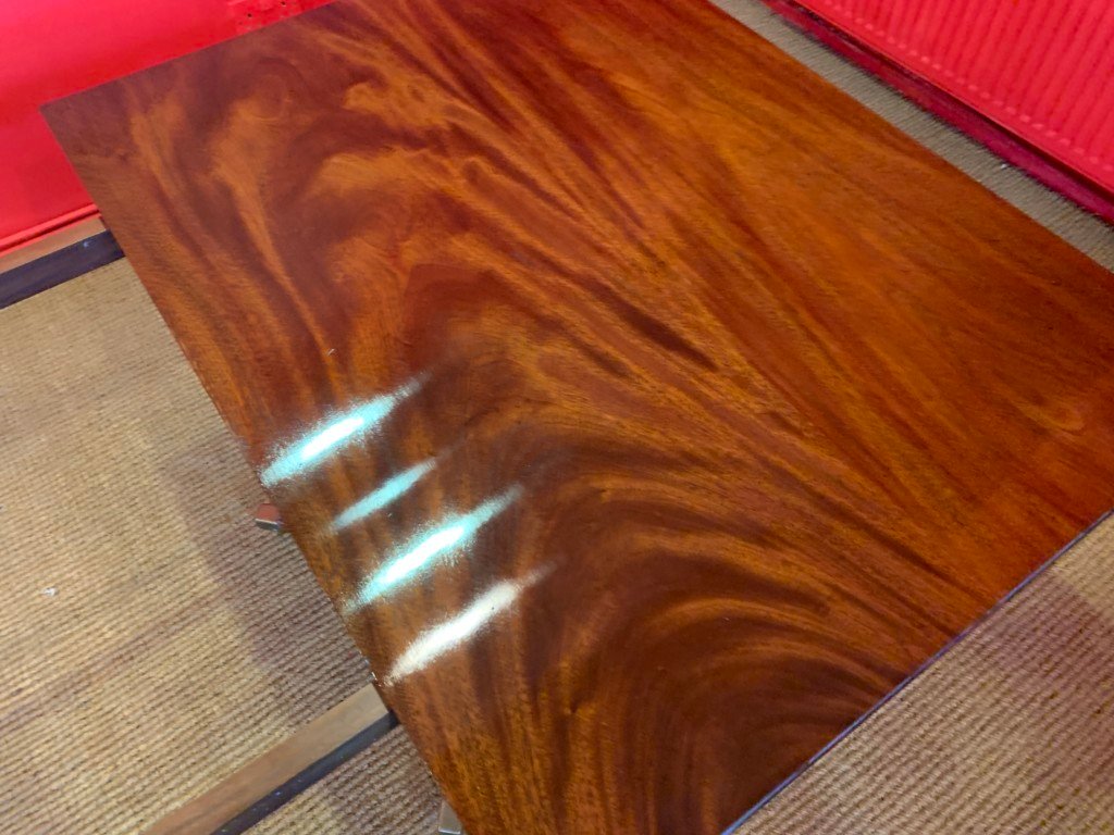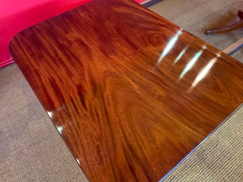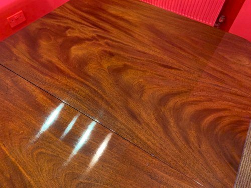 It’s just been professionally French polished in the traditional natural warm mahogany colour to show off the beautiful movement mahogany & will have once again that deep lustrous shine & gleam to it that still only hand French polishing can achieve using the very finest modern table top French Polishes & materials to obtain the stunning finish we desire, which also now give quite a hard & heat resistant finish compared to the old French Polishes of the past.