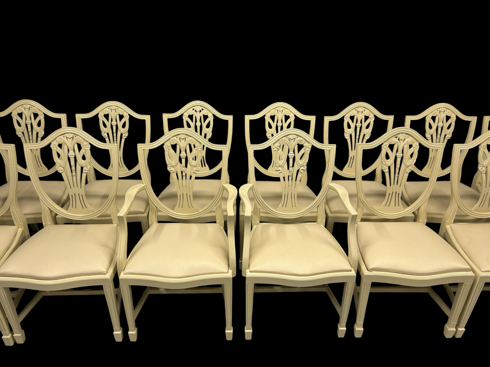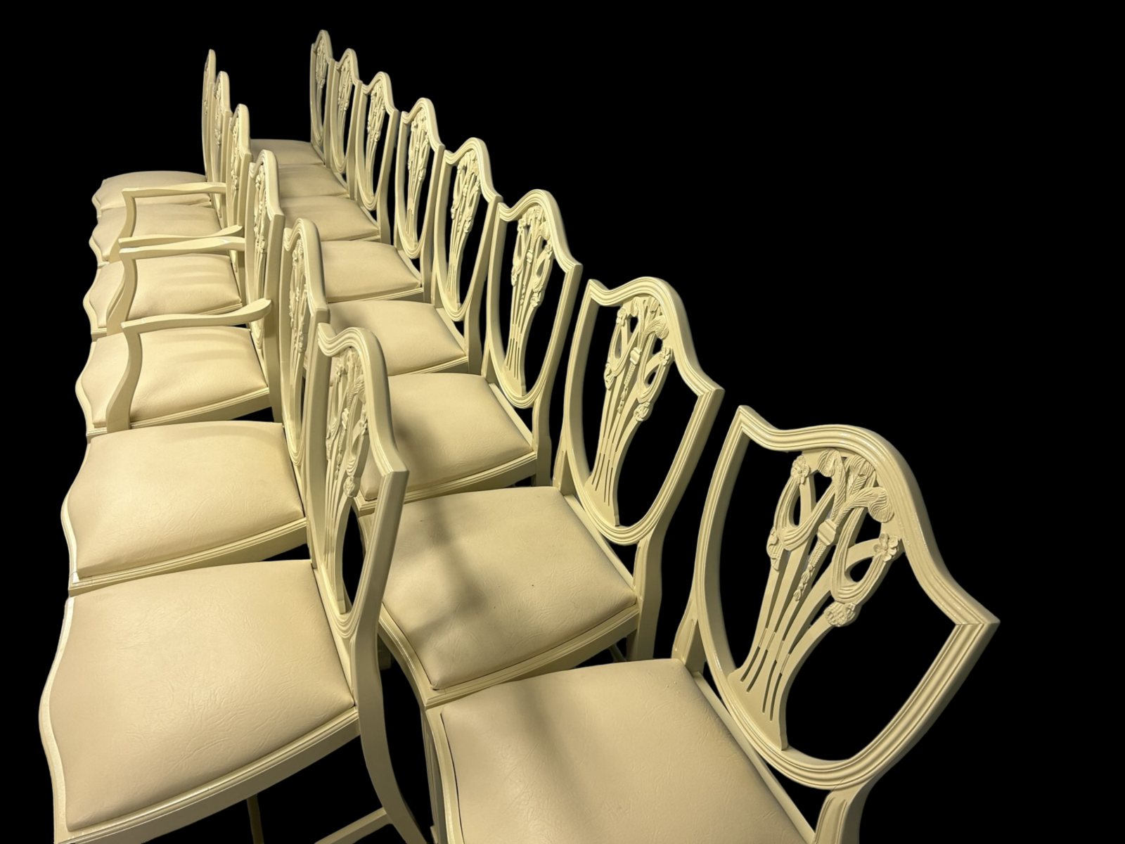 The set consists of both single side chairs and elegant carver armchairs, making them ideal for a grand dining arrangement.