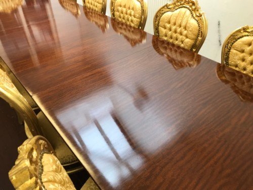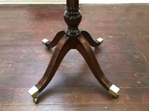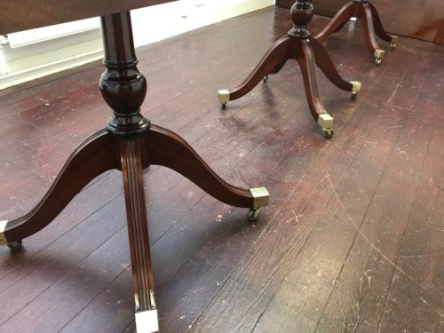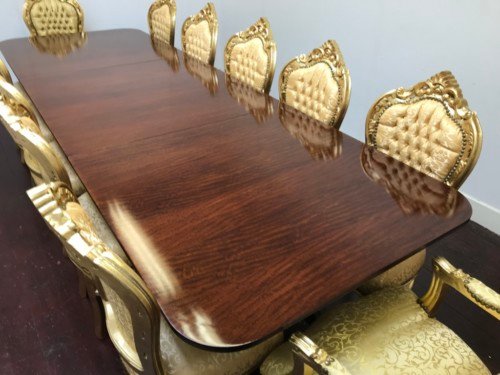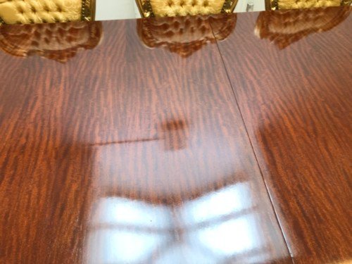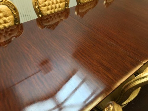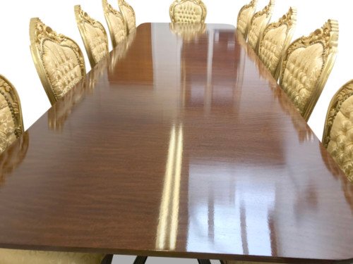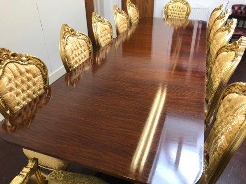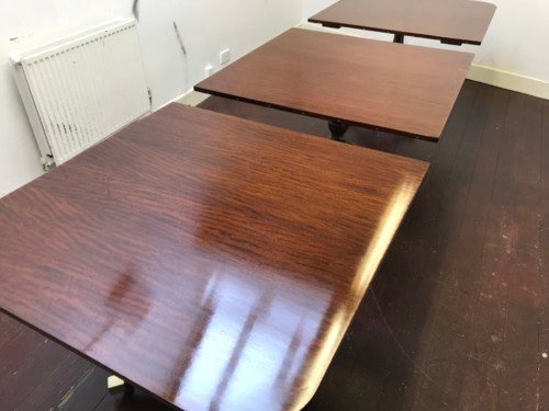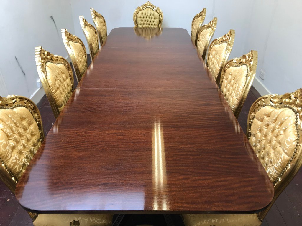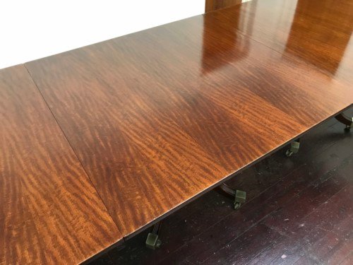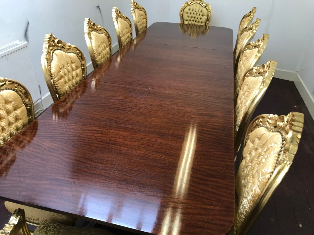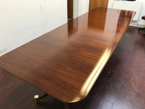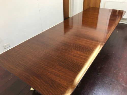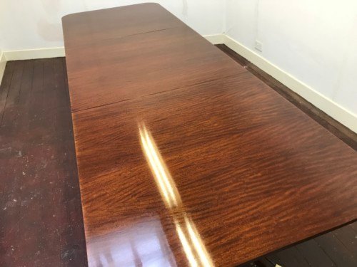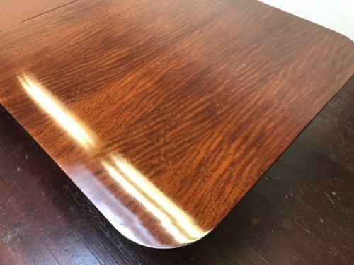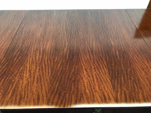 It’s just been French polished in the traditional rich natural warm mahogany colour to show off the beautiful movement mahogany and now has once again that deep lustrous shine and gleam to it that still only hand French polishing can achieve using the very finest modern table top French Polishes & materials to obtain the stunning finish we desire, which also now give quite a hard & heat resistant finish compared to the old French Polishes of the past.