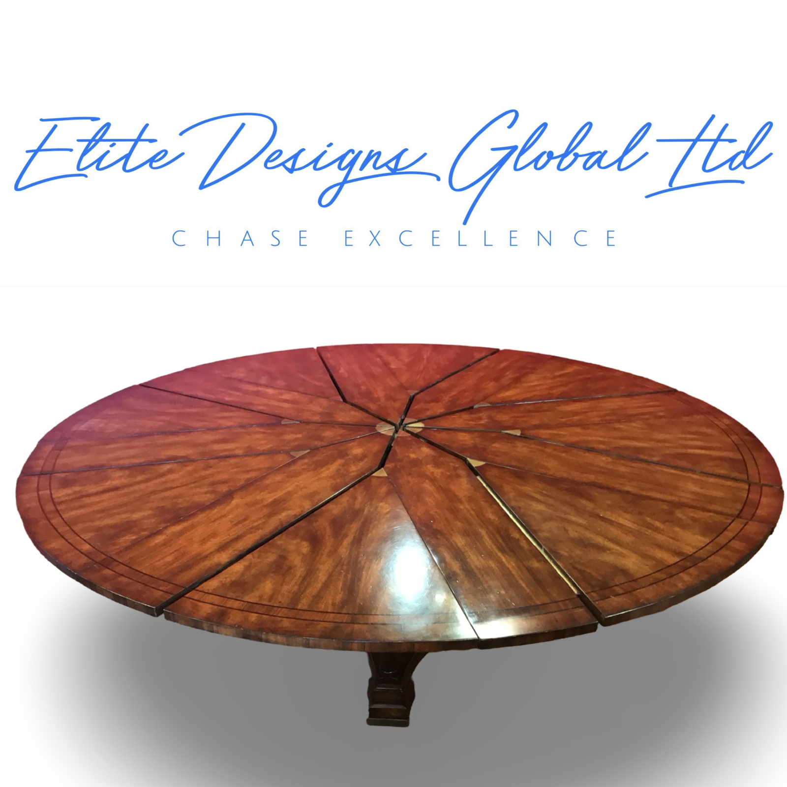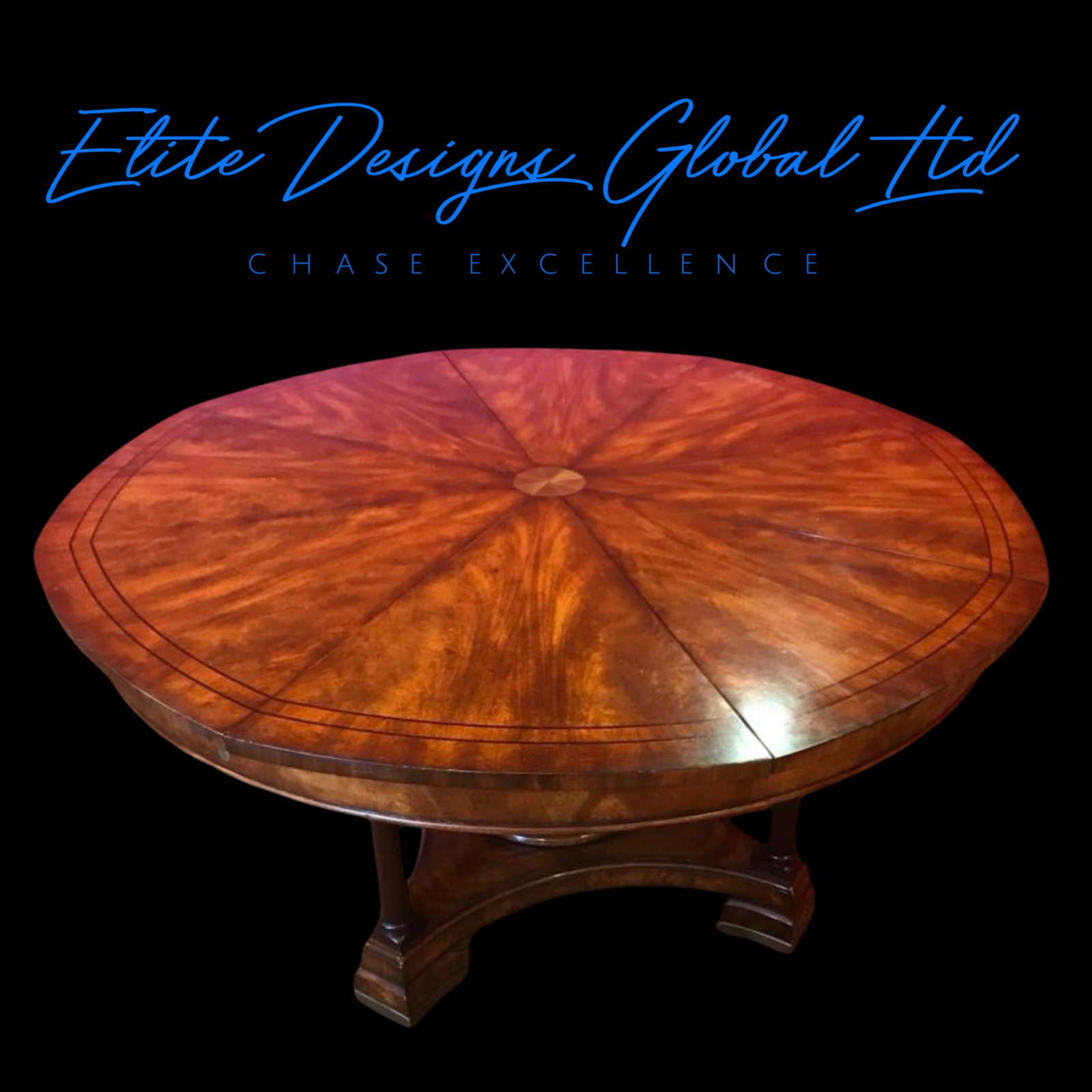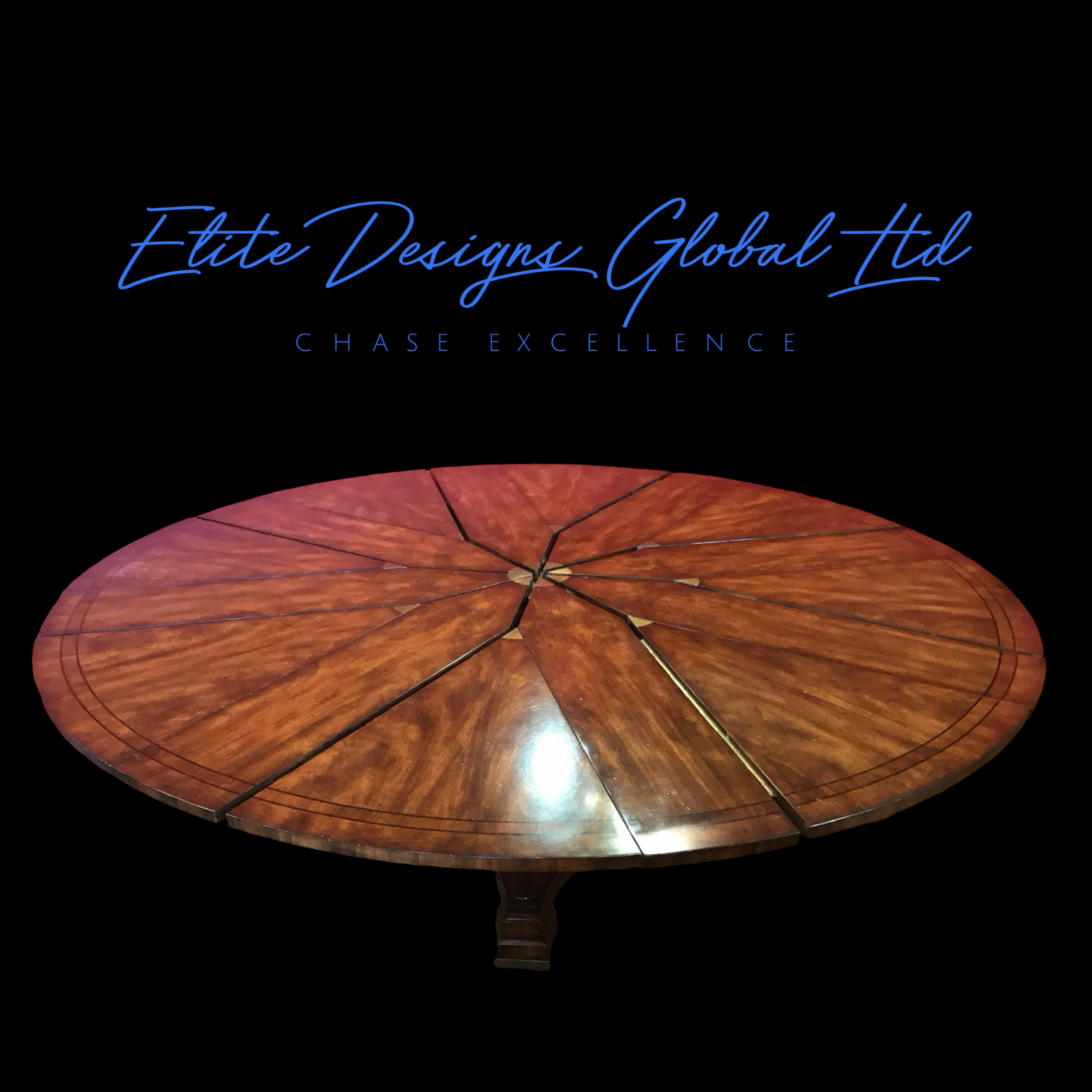 The Jupe expanding dining table was invented in 1835 by English cabinet maker Theodore Alexander Robert Jupe. His revolutionary patent described a circular table constructed so that its sections diverge from a central point, allowing radial leaves to be inserted — creating a seamless expansion.