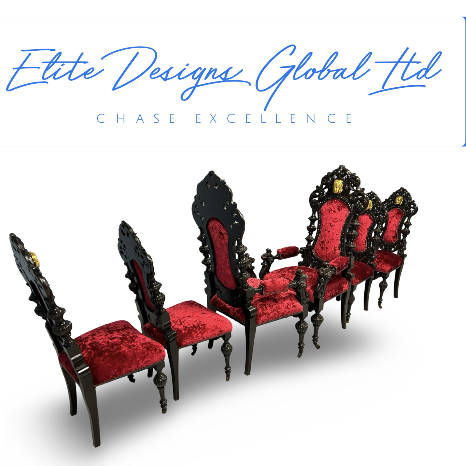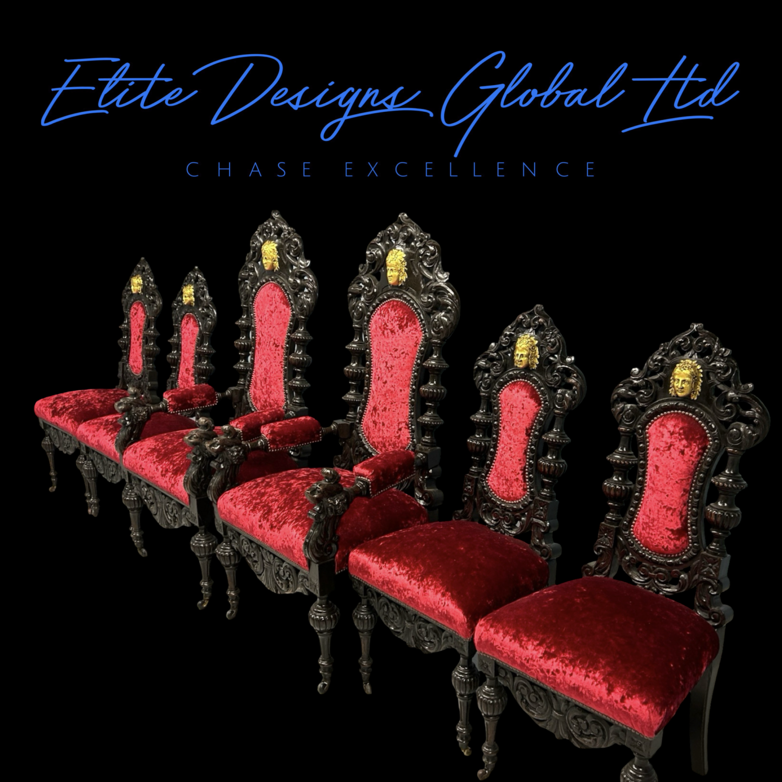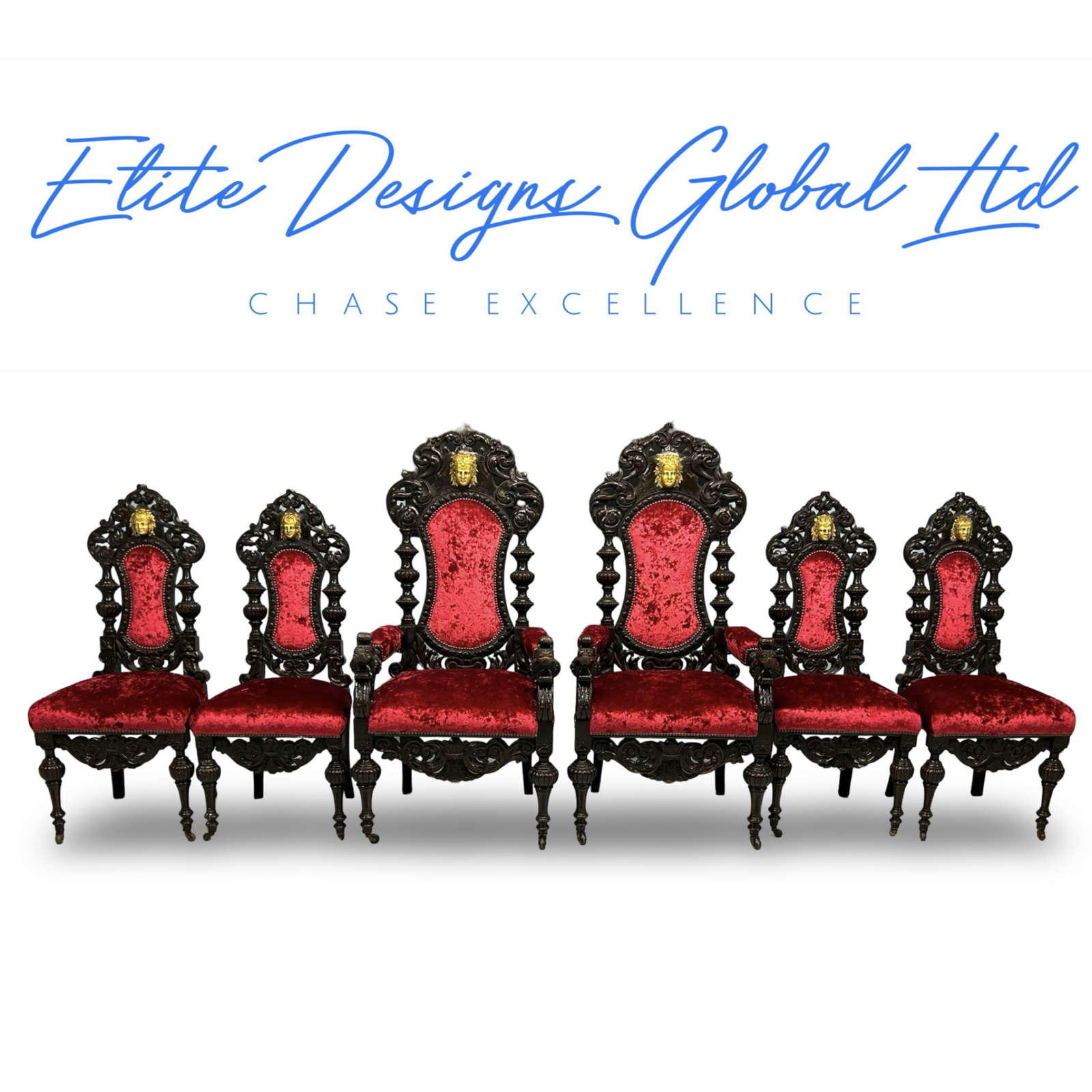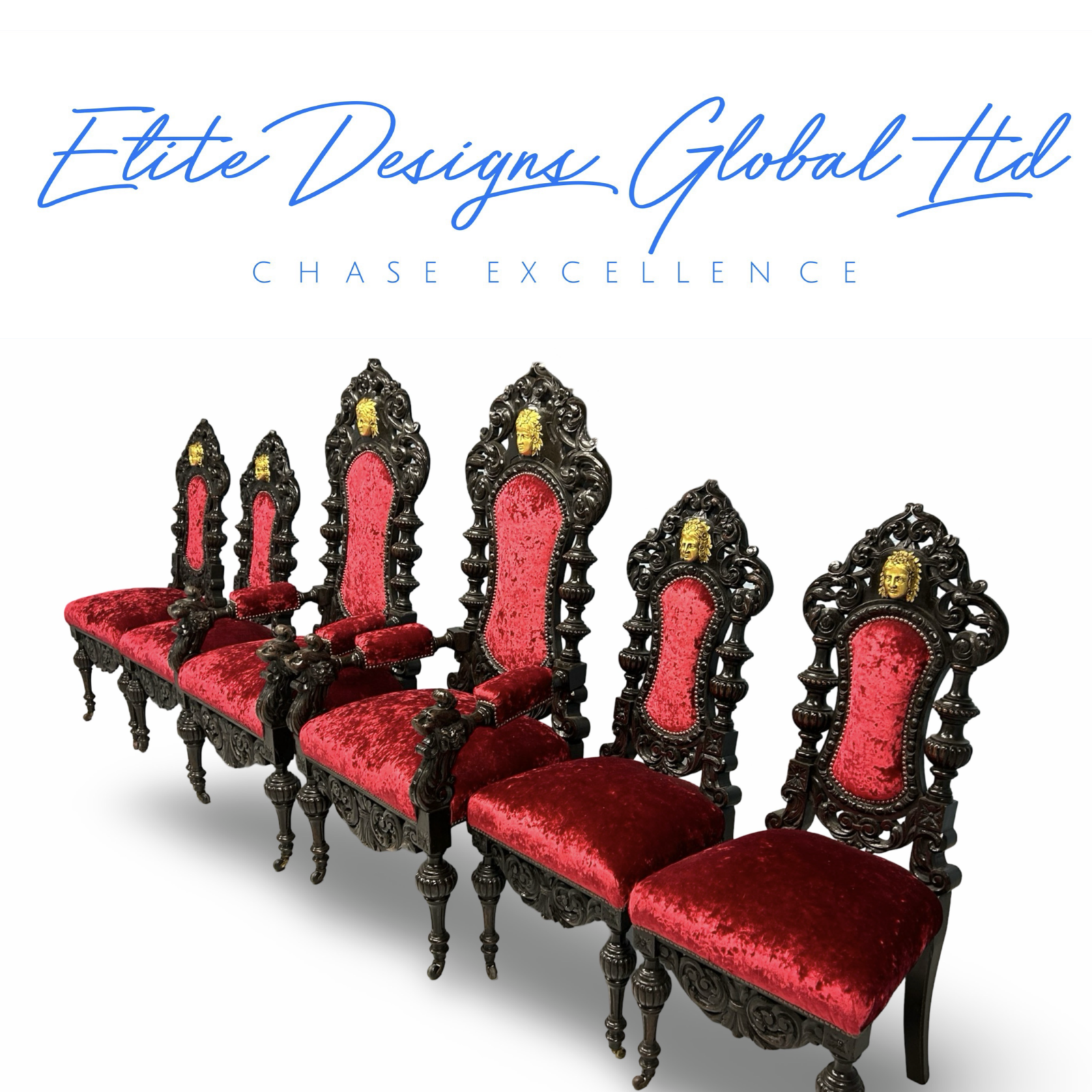 - Tall, throne-like backs with dramatic scrolled and pierced carvings