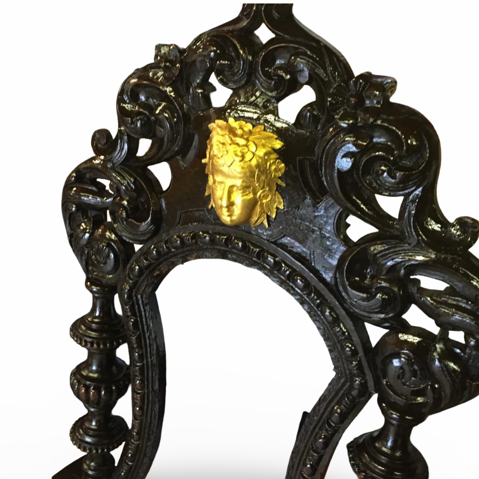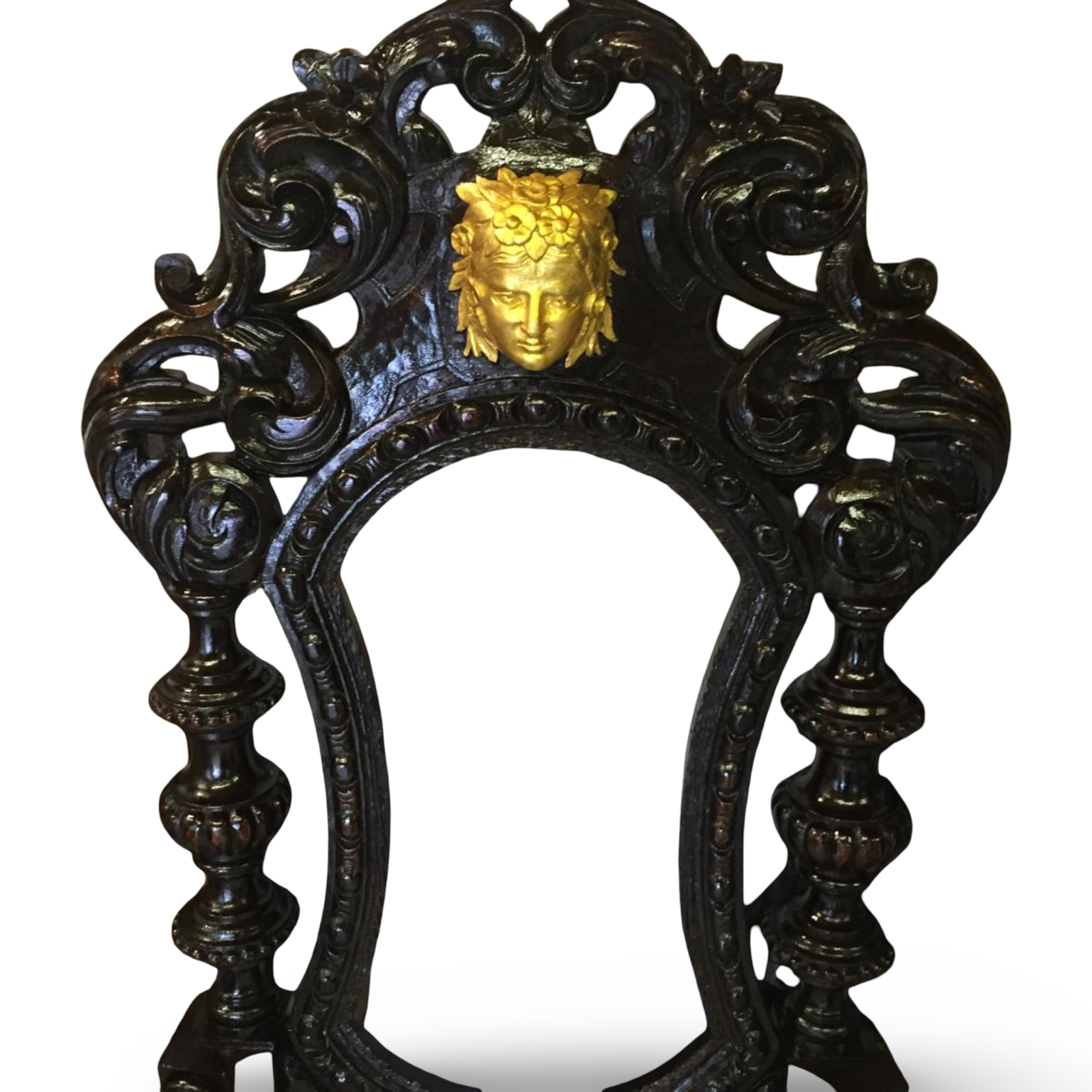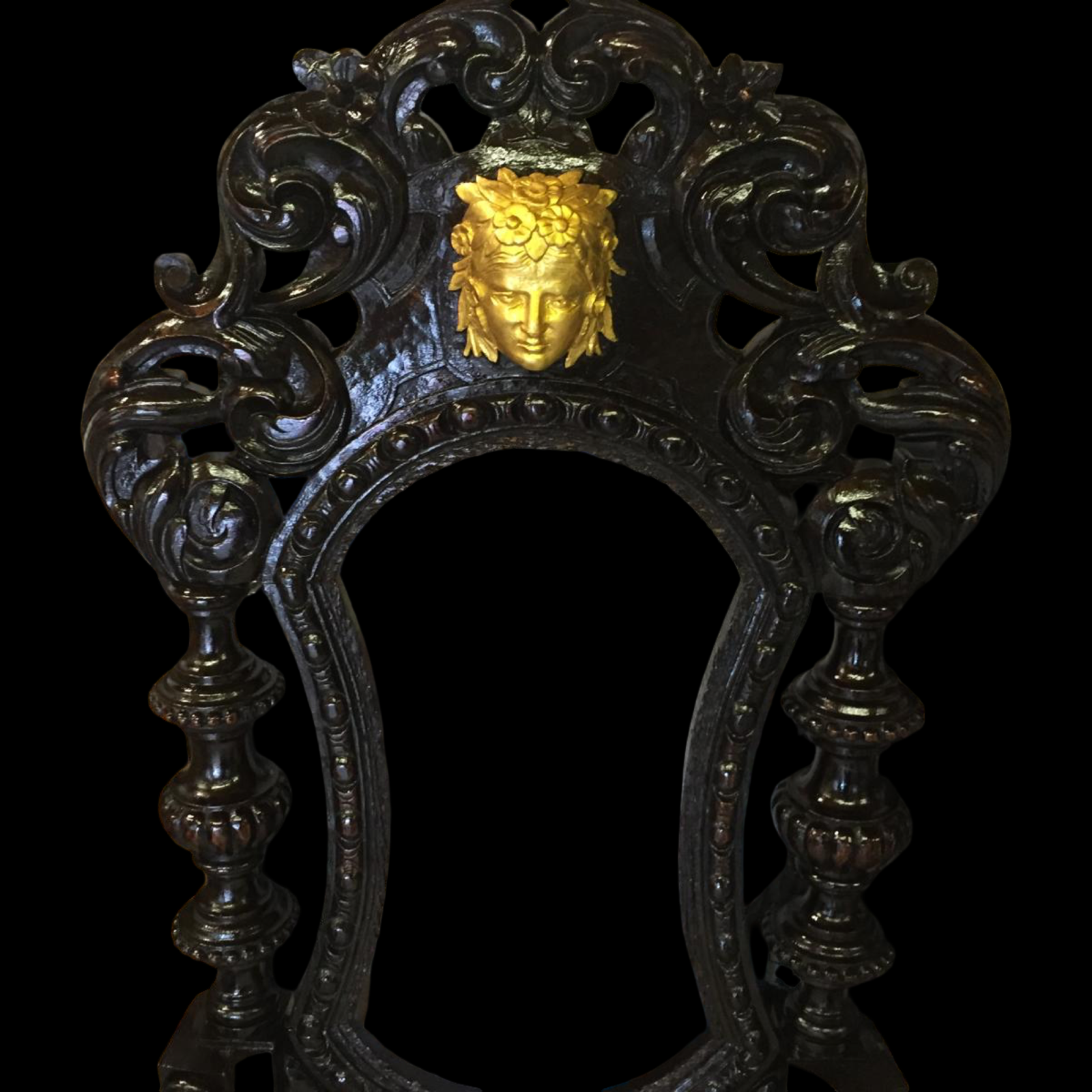 - Prominent hand-carved classical female mask motifs set within the cresting rail, finished in gilt for striking contrast