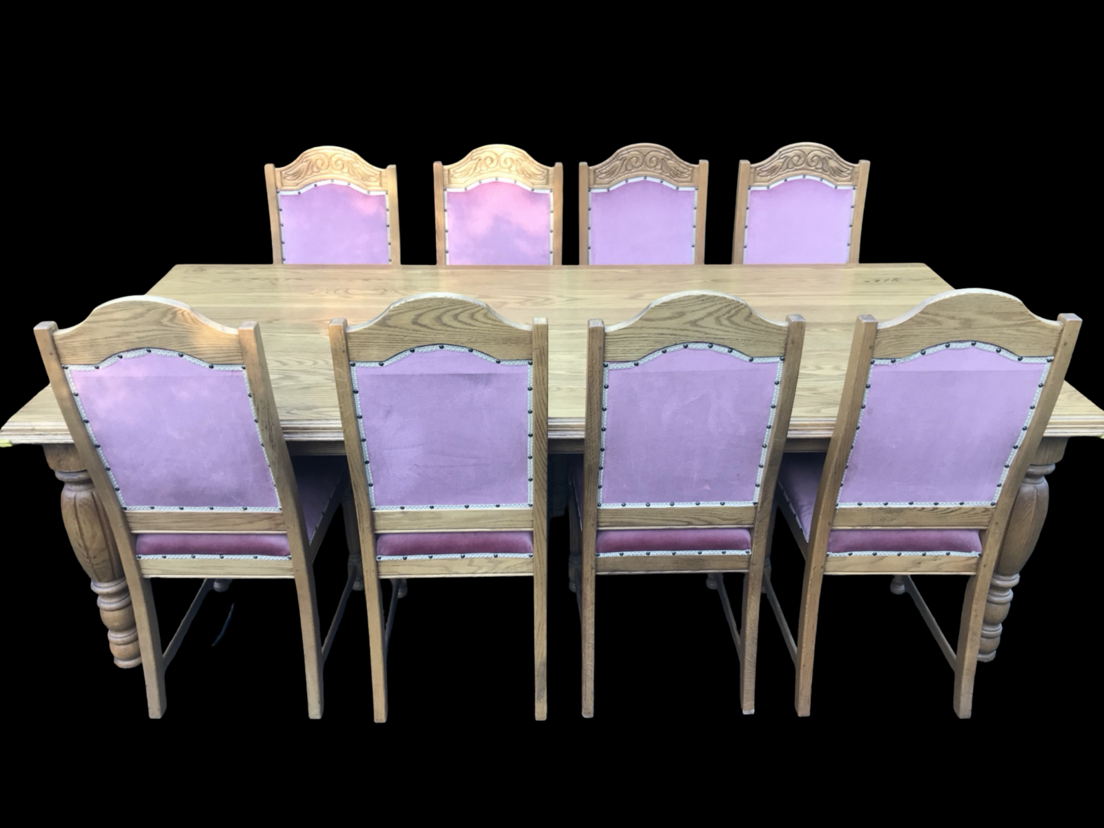 The table is supported by bold, hand-turned oak legs — a traditional detail that adds strength, symmetry and architectural presence.