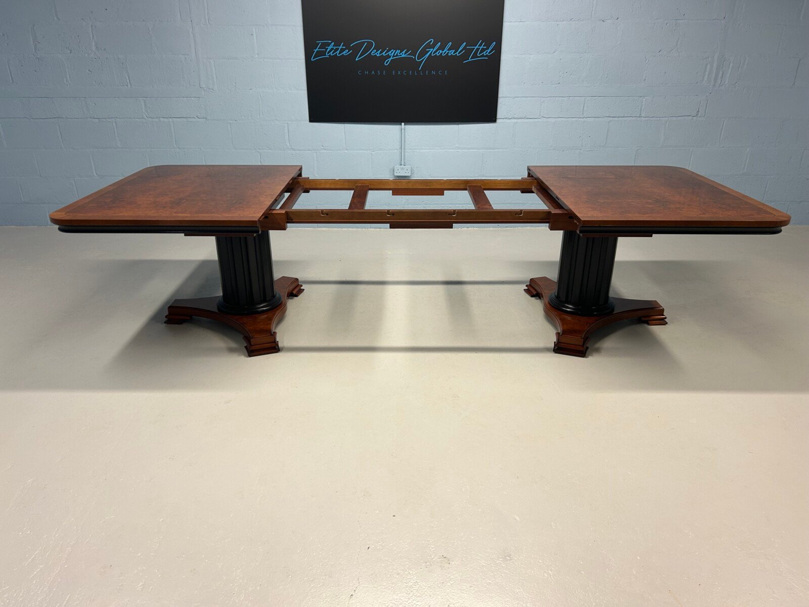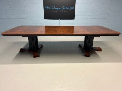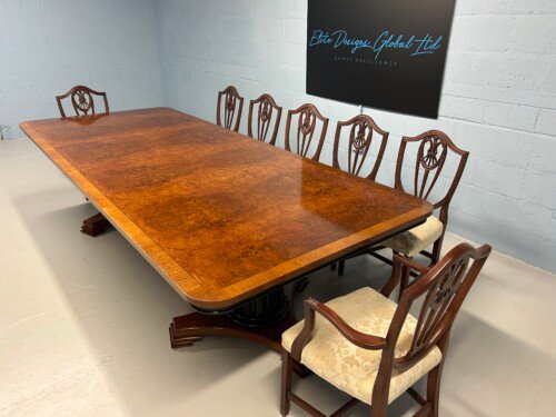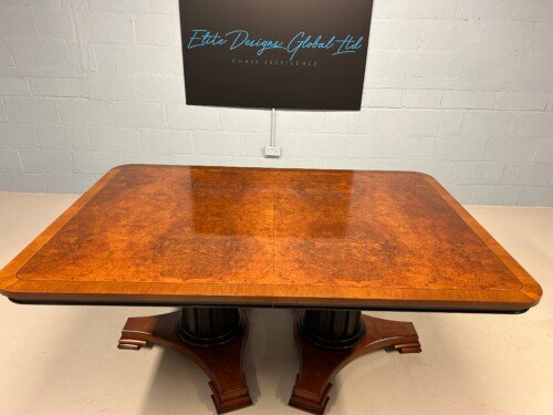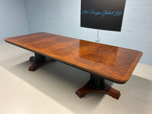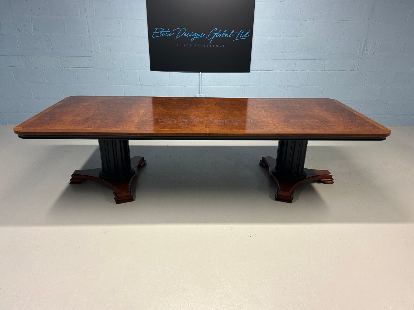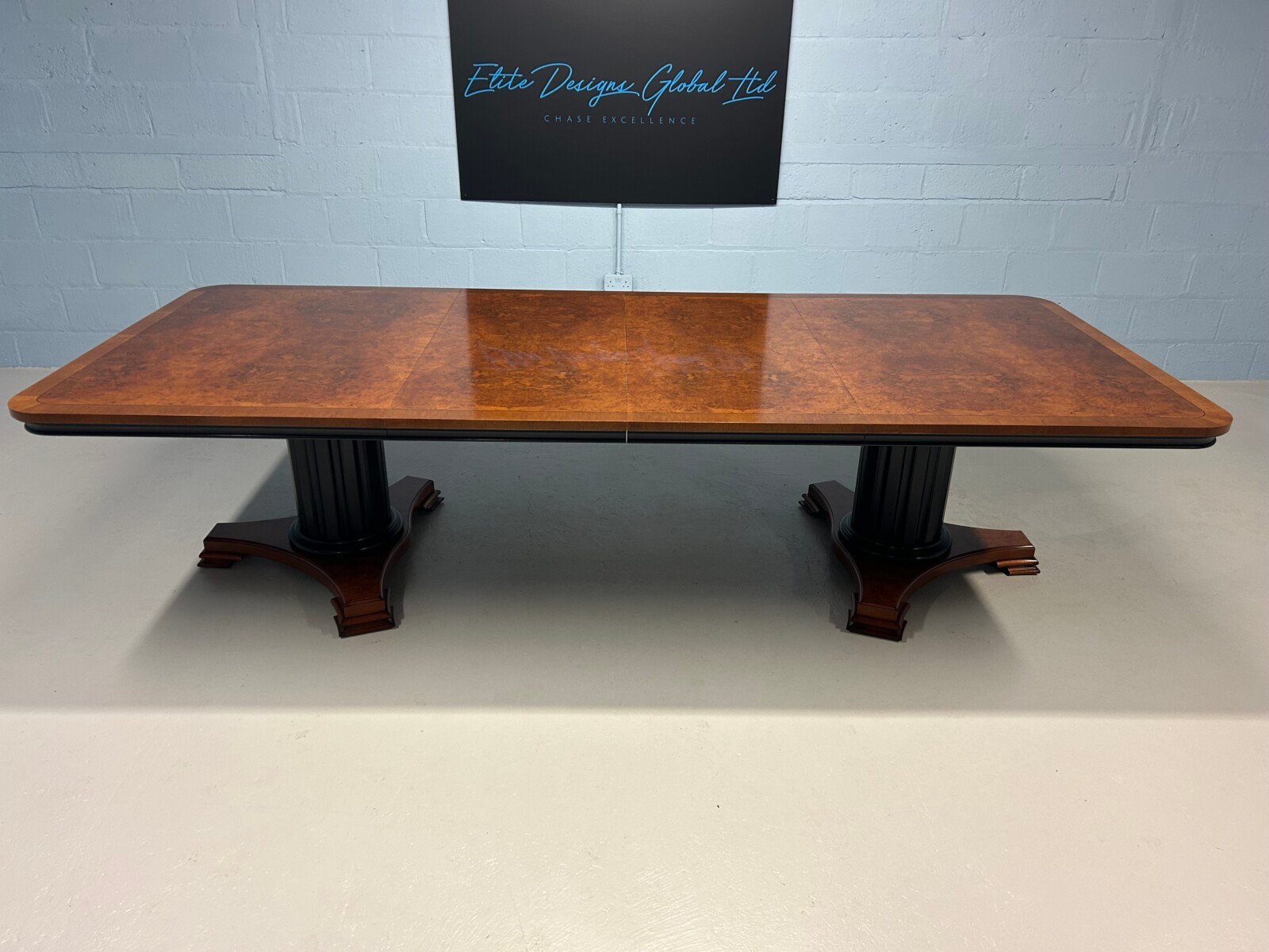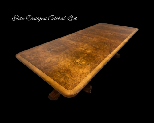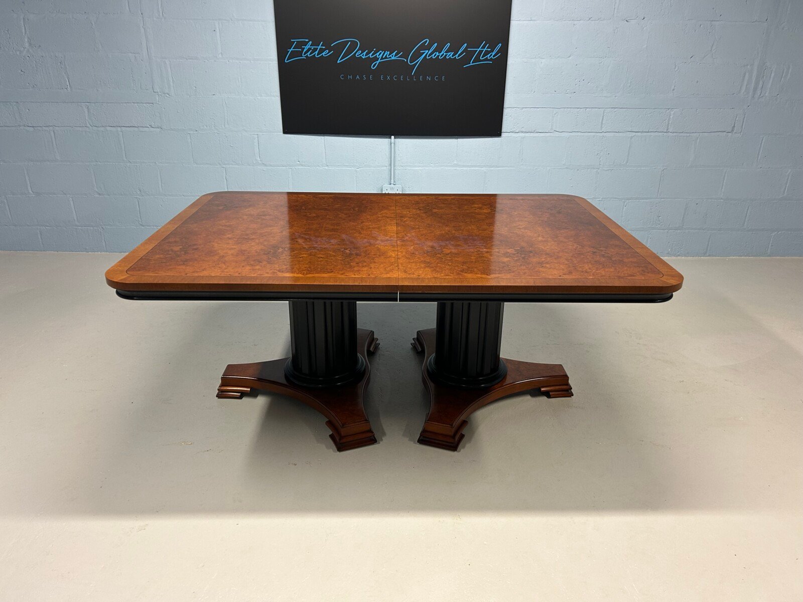 Elite Designs Global UK is proud to present a world-class, two-tone bespoke handmade Burr Walnut dining table. This exquisite piece combines the timeless beauty of Burr Walnut with a modern twist — featuring rims and pedestal bases finished in Farrow & Ball Pitch Black lacquer/polish, created exclusively for us.
