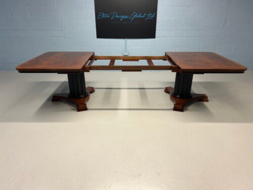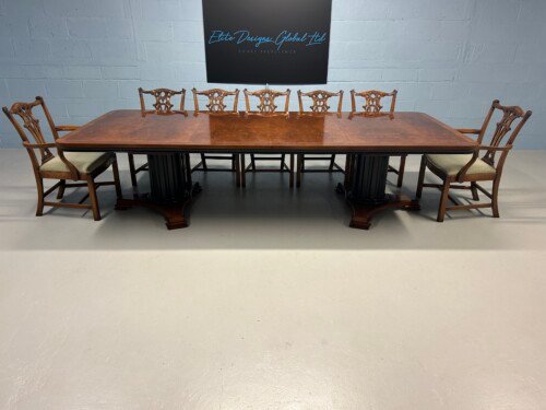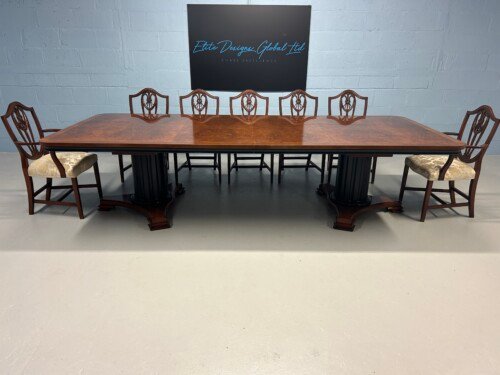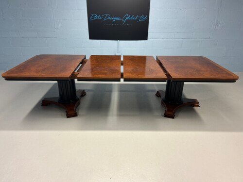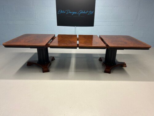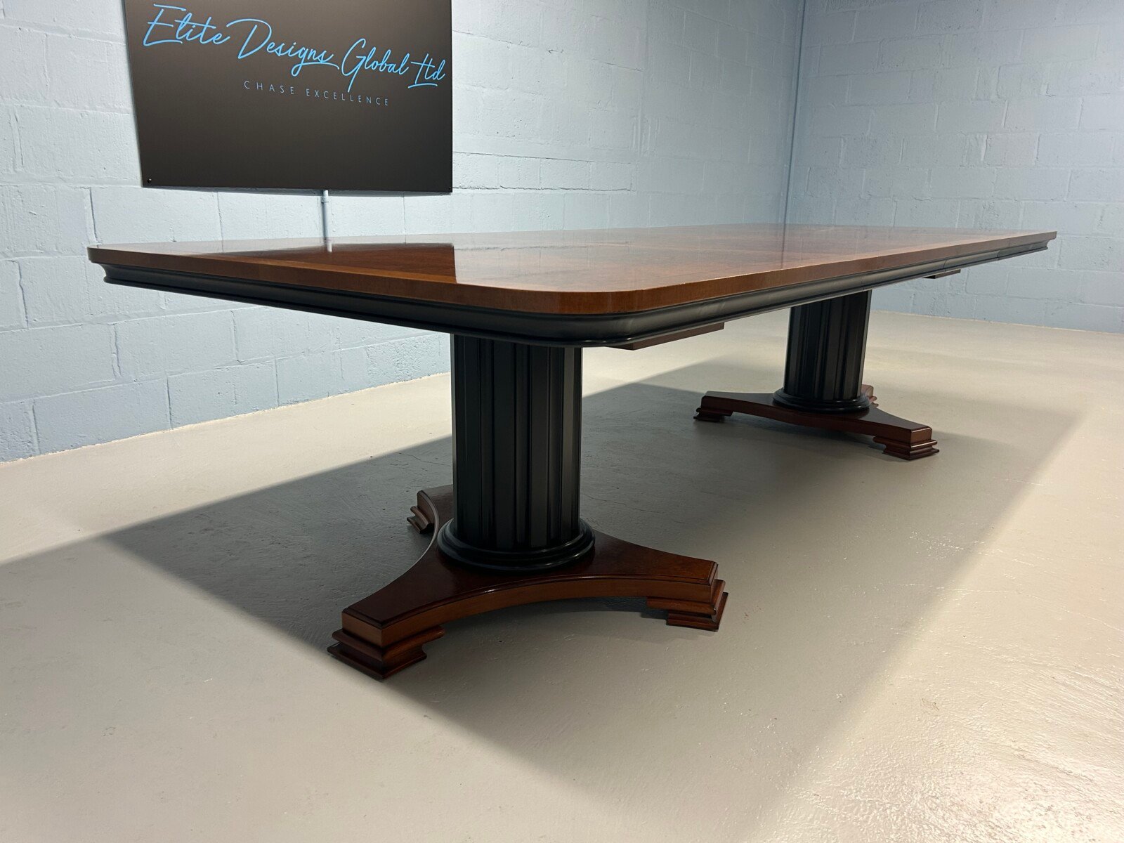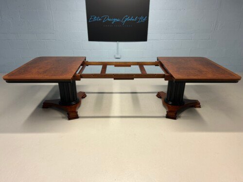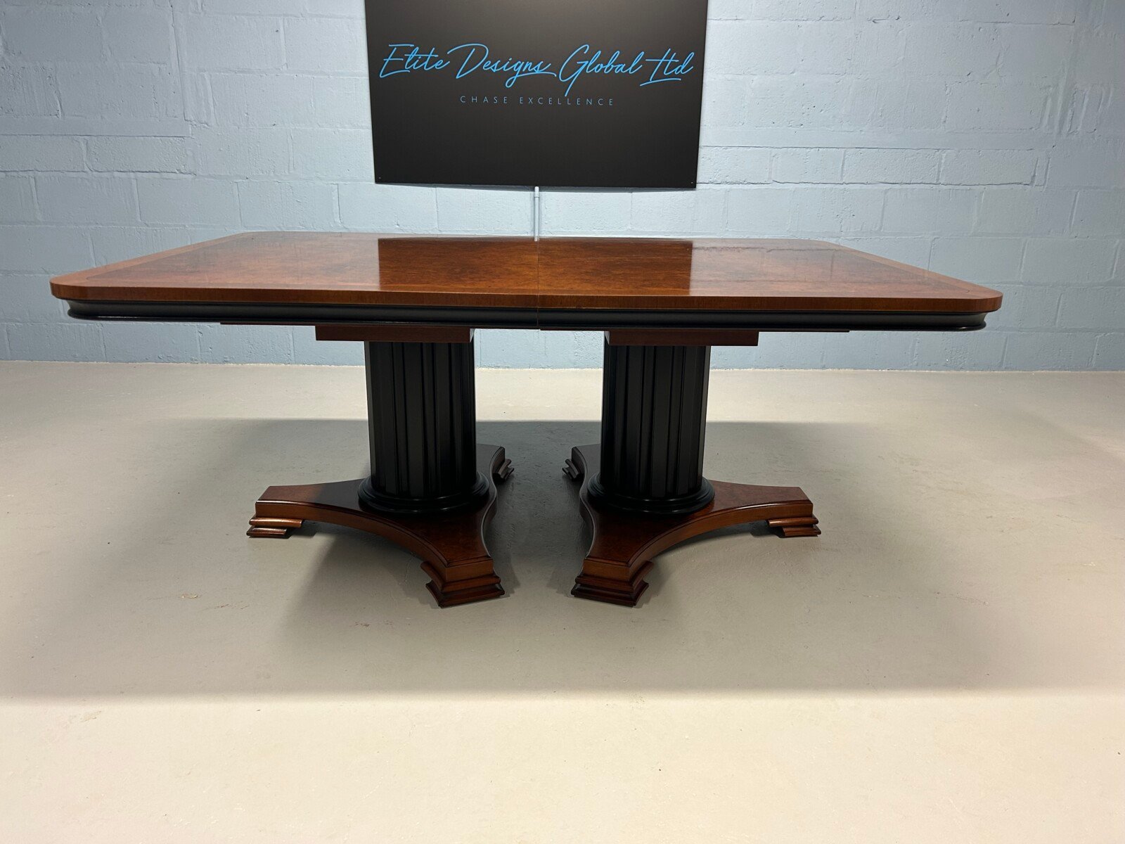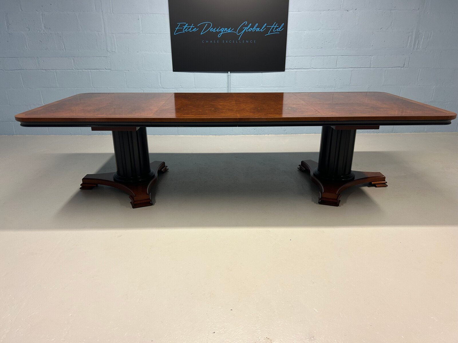 Elite Designs Global UK is proud to present a world-class, two-tone bespoke handmade Burr Walnut dining table. This exquisite piece combines the timeless beauty of Burr Walnut with a modern twist — featuring rims and pedestal bases finished in Farrow & Ball Pitch Black lacquer/polish, created exclusively for us.
