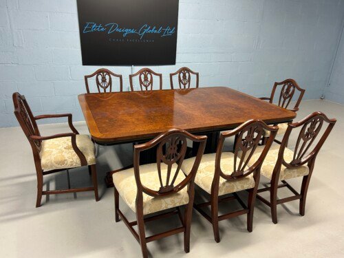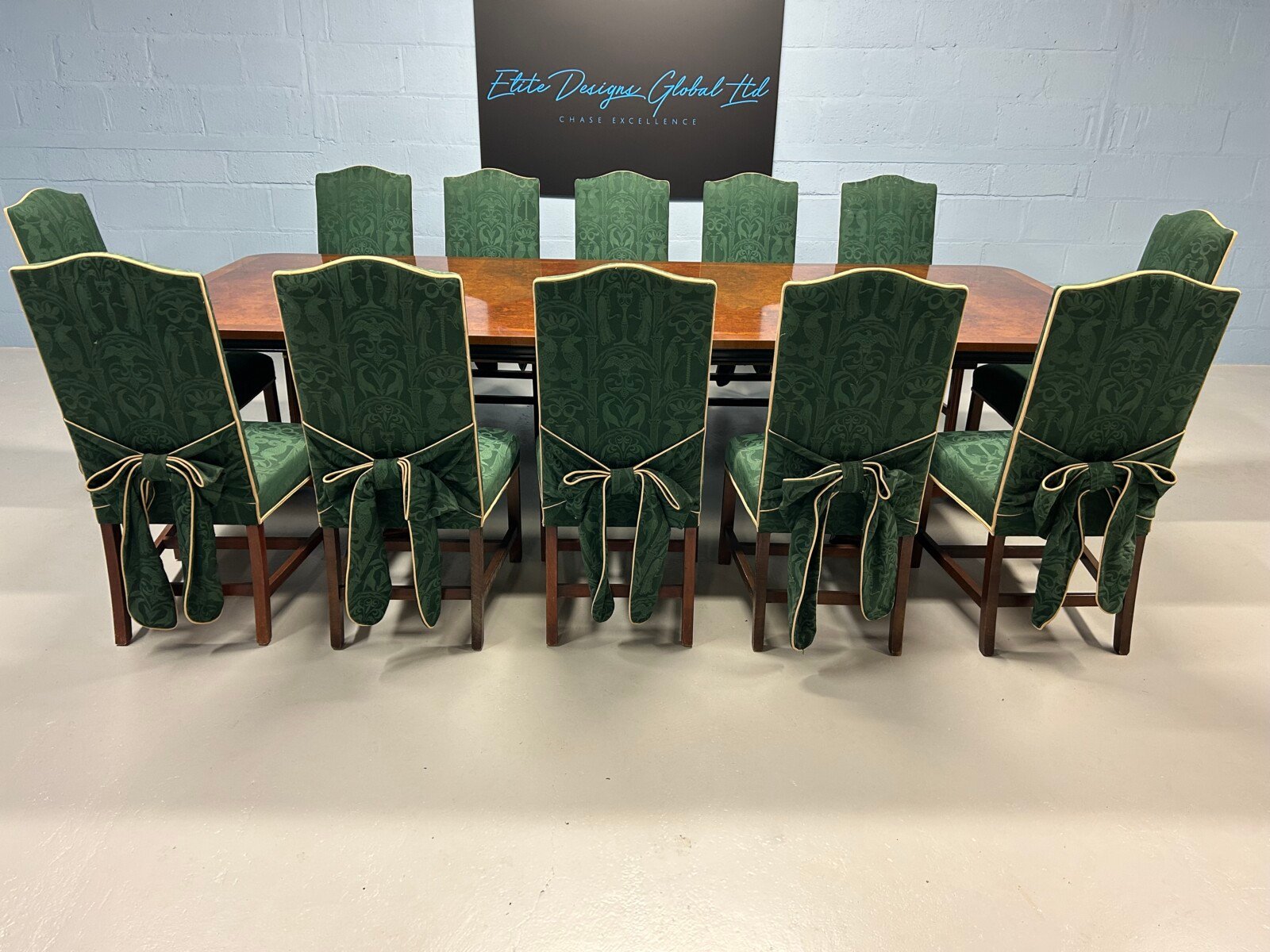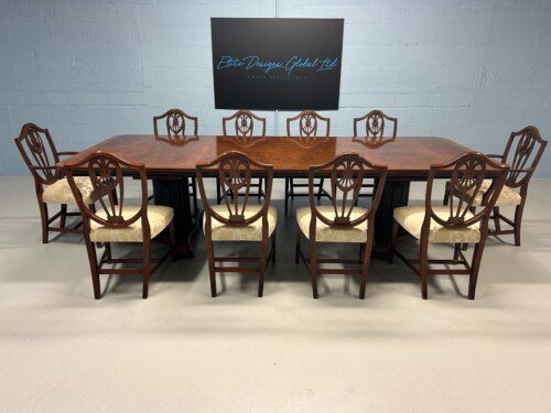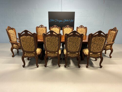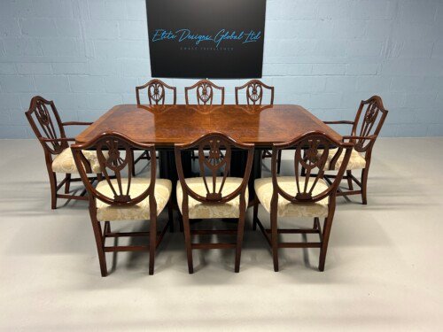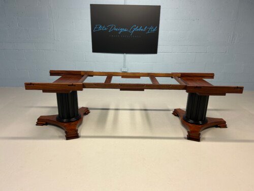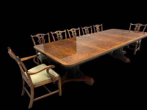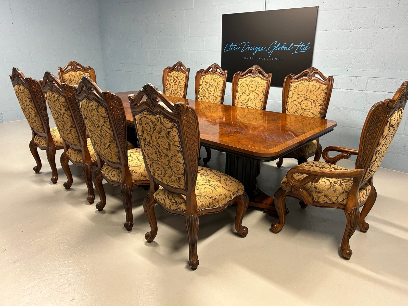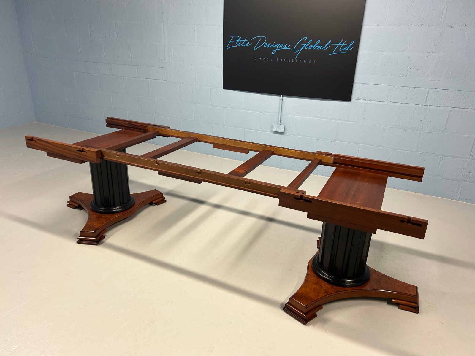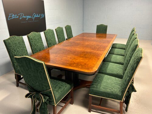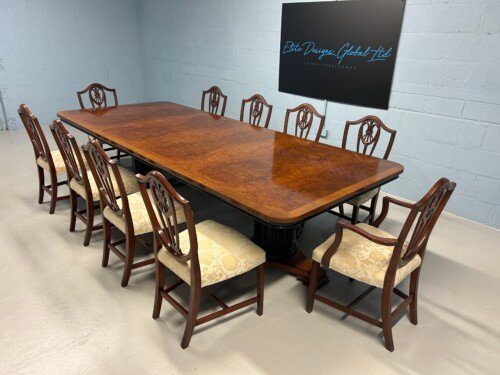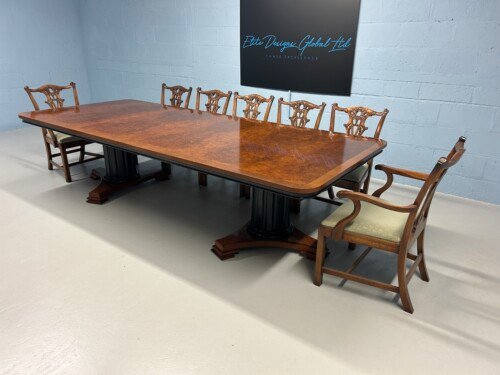 Elite Designs Global UK is proud to present a world-class, two-tone bespoke handmade Burr Walnut dining table. This exquisite piece combines the timeless beauty of Burr Walnut with a modern twist — featuring rims and pedestal bases finished in Farrow & Ball Pitch Black lacquer/polish, created exclusively for us.