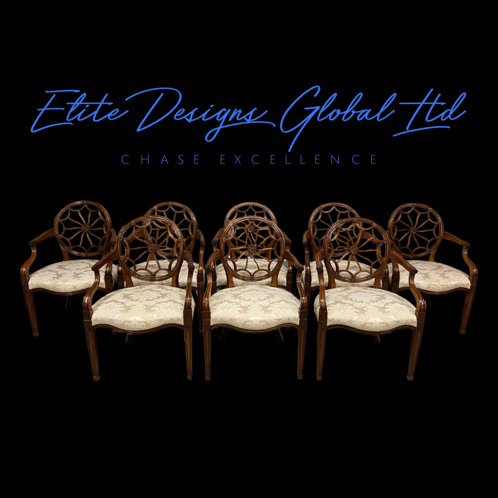 8 Elite Exquisite very rare designer mahogany carver dining chairs.